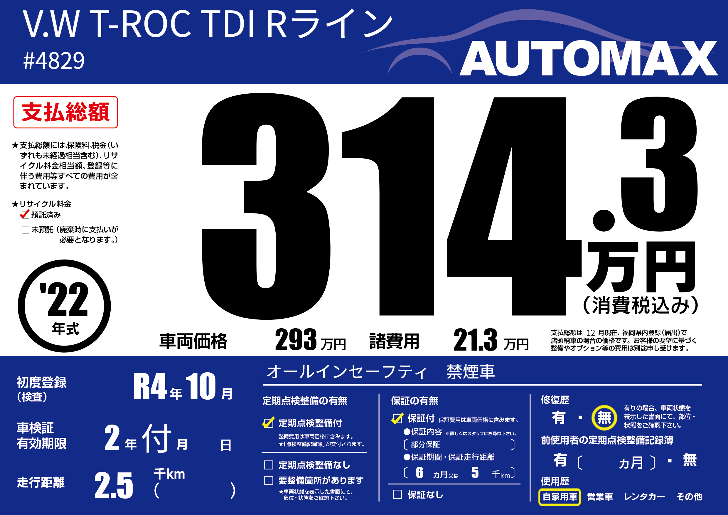 | 車名 | V.W T-ROC TDI Rライン | グレード ミッション 排気量 |