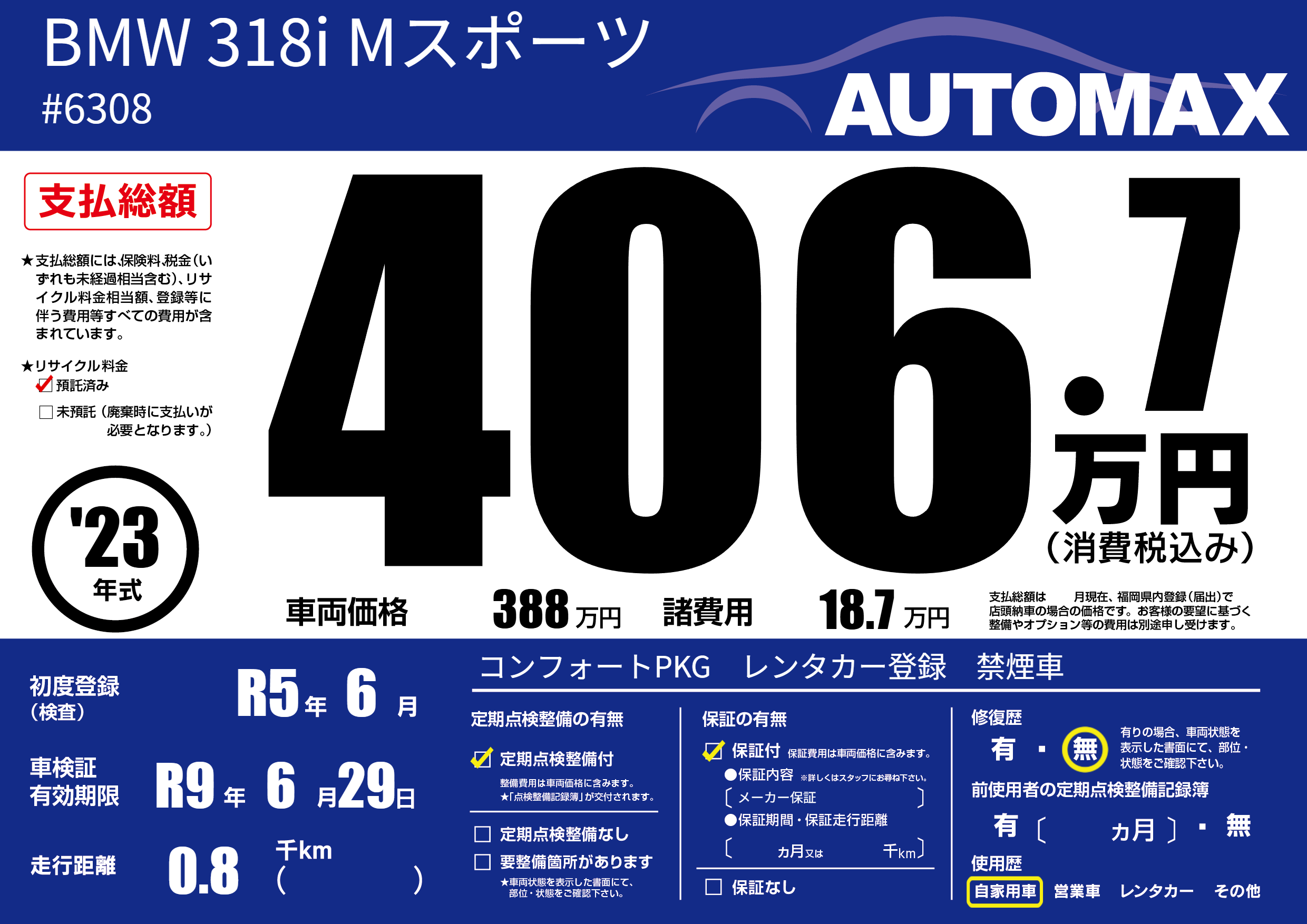 | 車名 | BMW 318i Mスポーツ | グレード ミッション 排気量 |