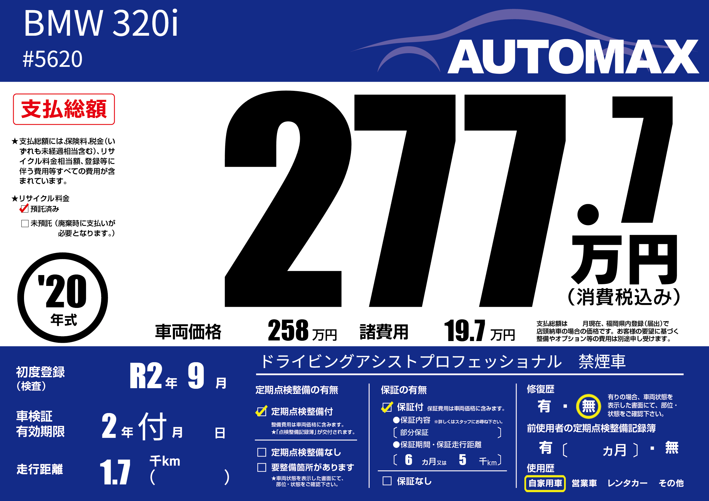 | 車名 | BMW 320i | グレード ミッション 排気量 |