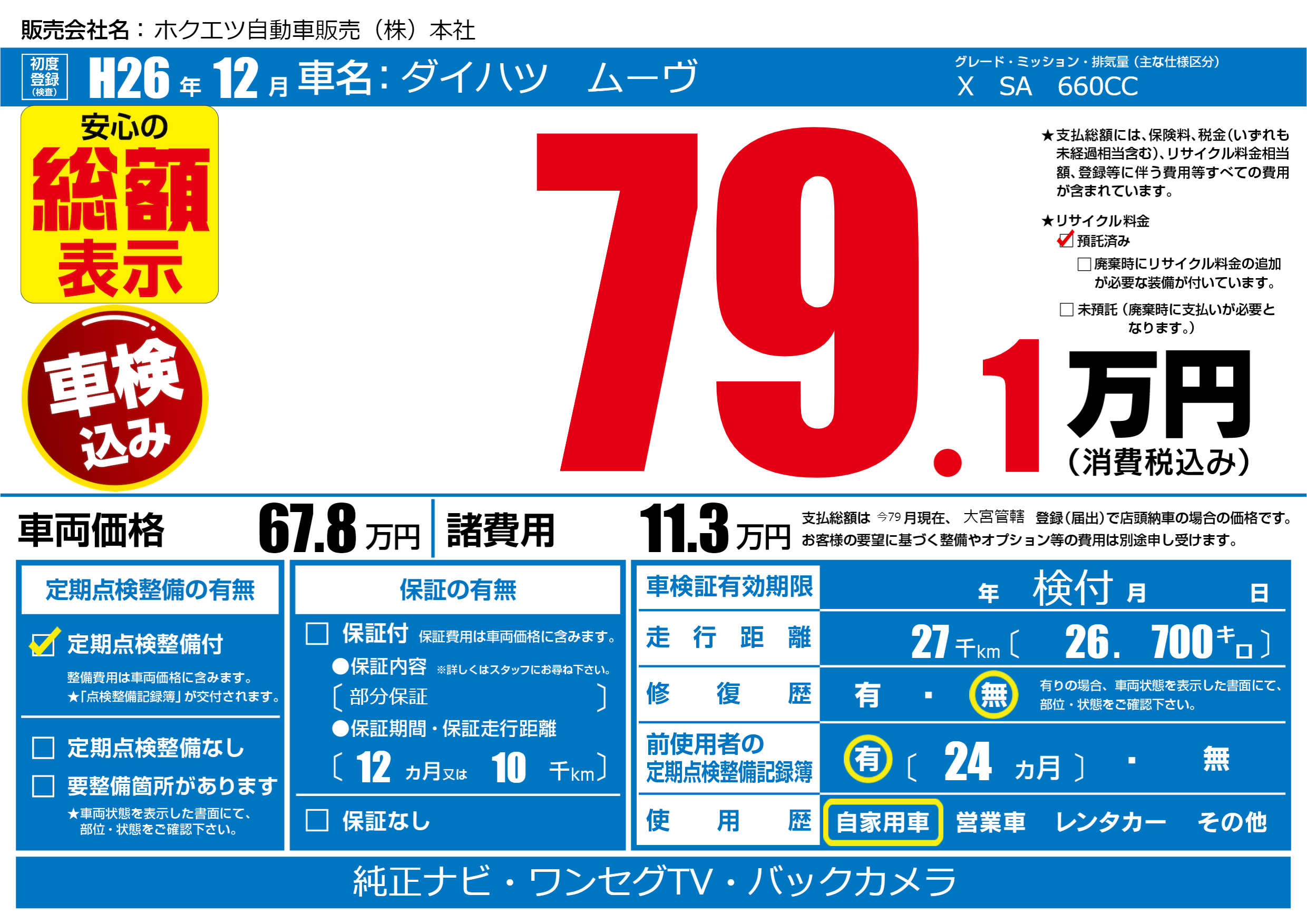 | 走行キロ | 2.7万km | 初年度登録 | H26年12月 |