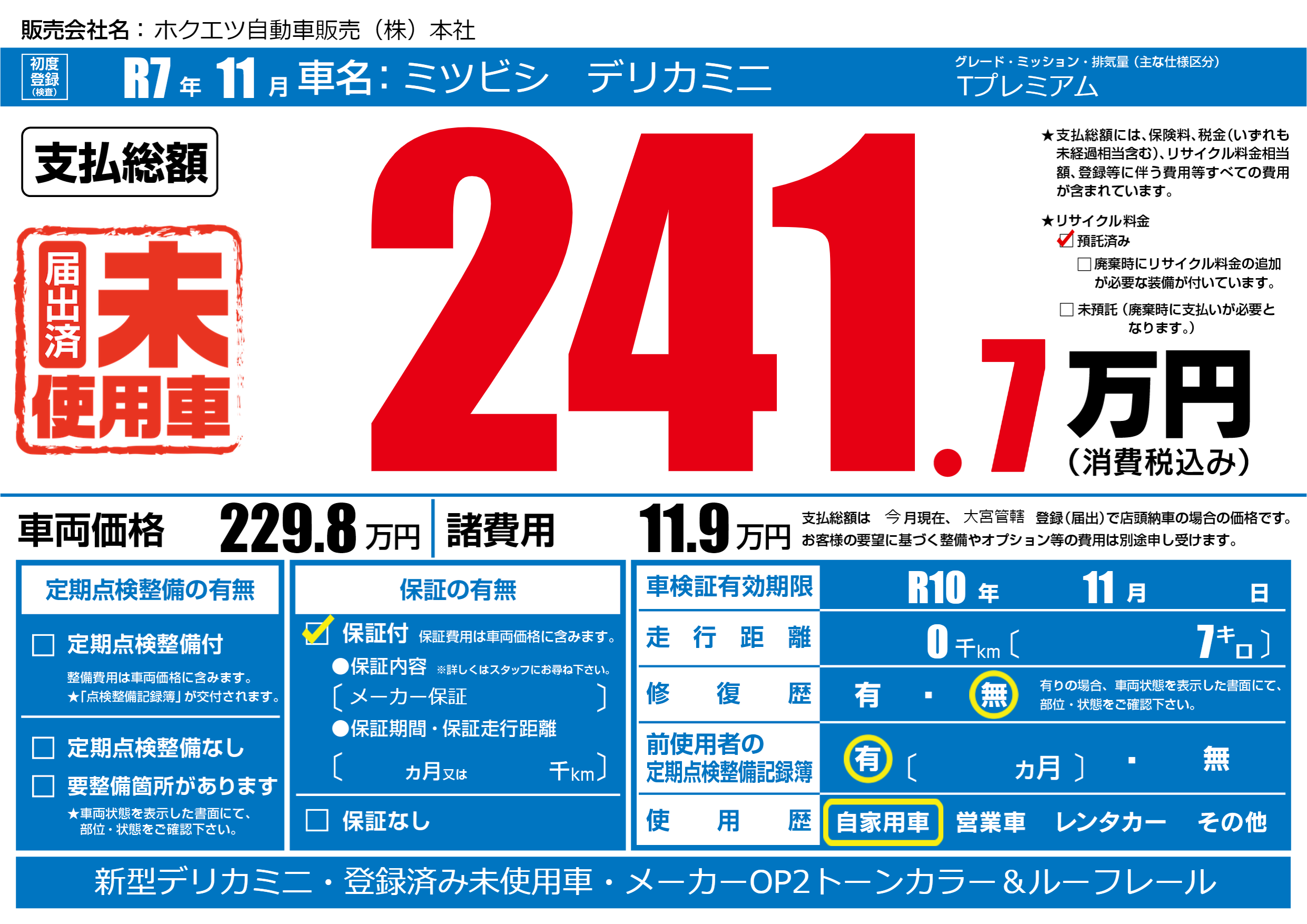 | 走行キロ | - | 初年度登録 | R7年11月 |