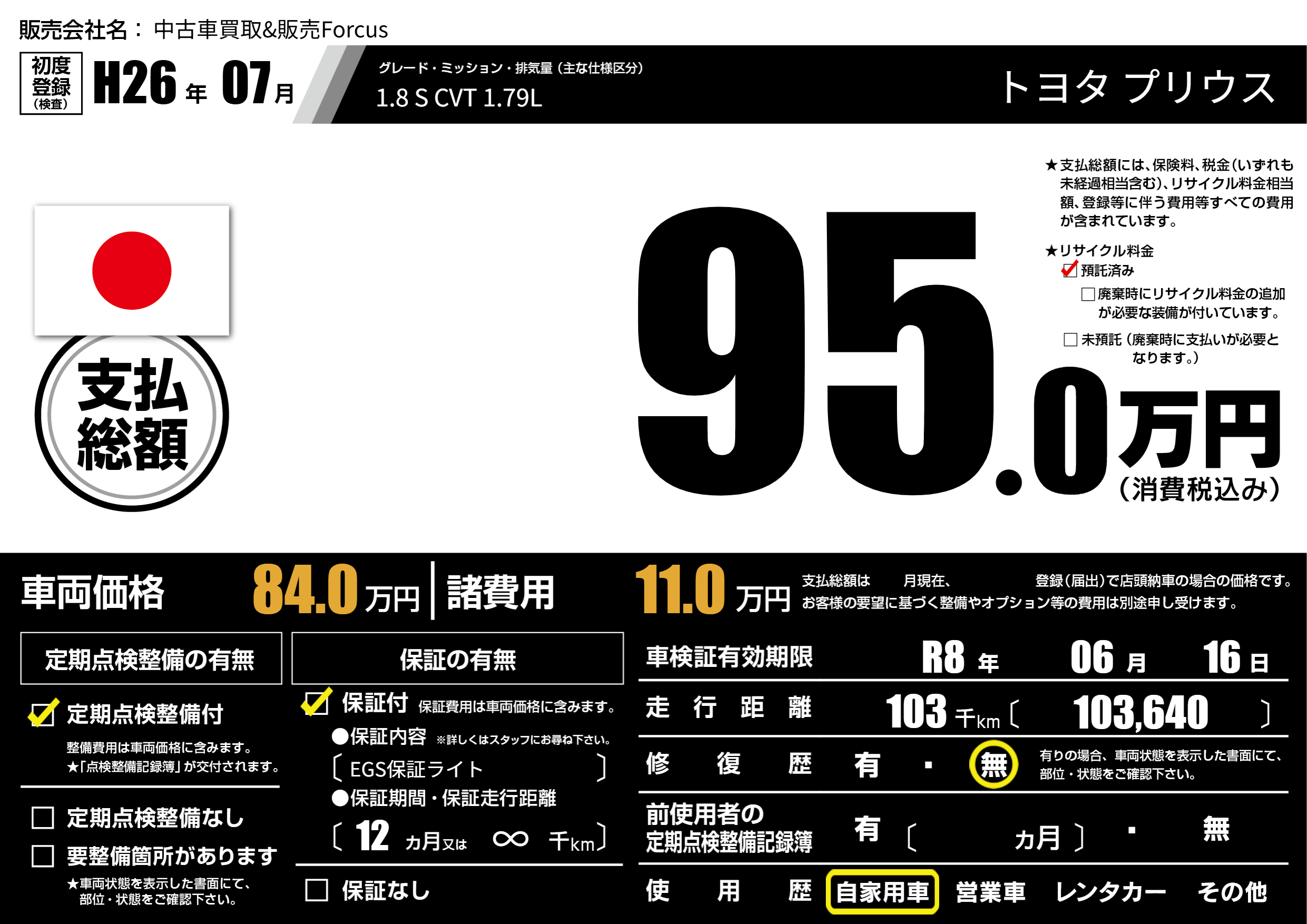 | 車名 | トヨタ プリウス | グレード ミッション 排気量 |