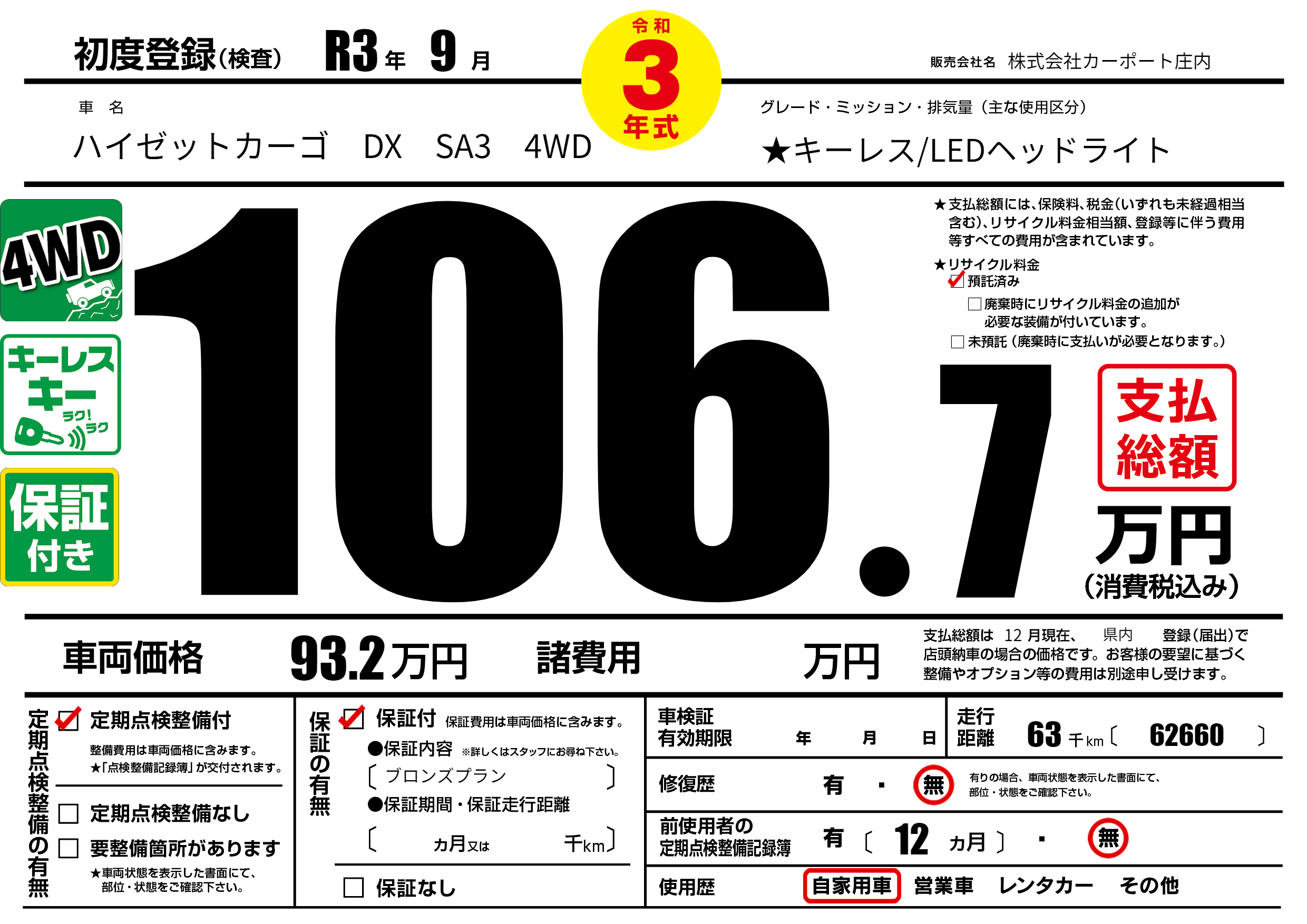 | 車名 | ハイゼットカーゴ DX SA3 4WD | グレード ミッション 排気量 |