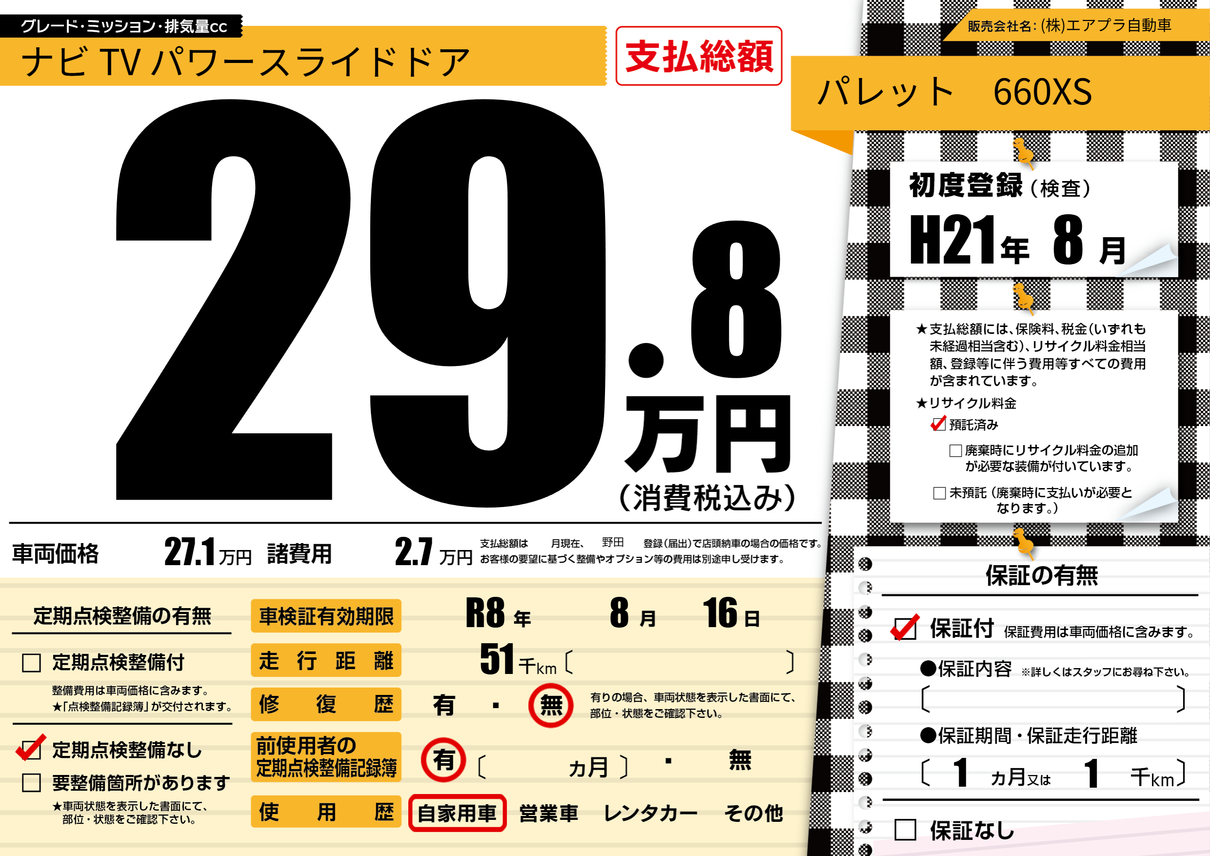 | 車名 | パレット 660XS | グレード ミッション 排気量 |