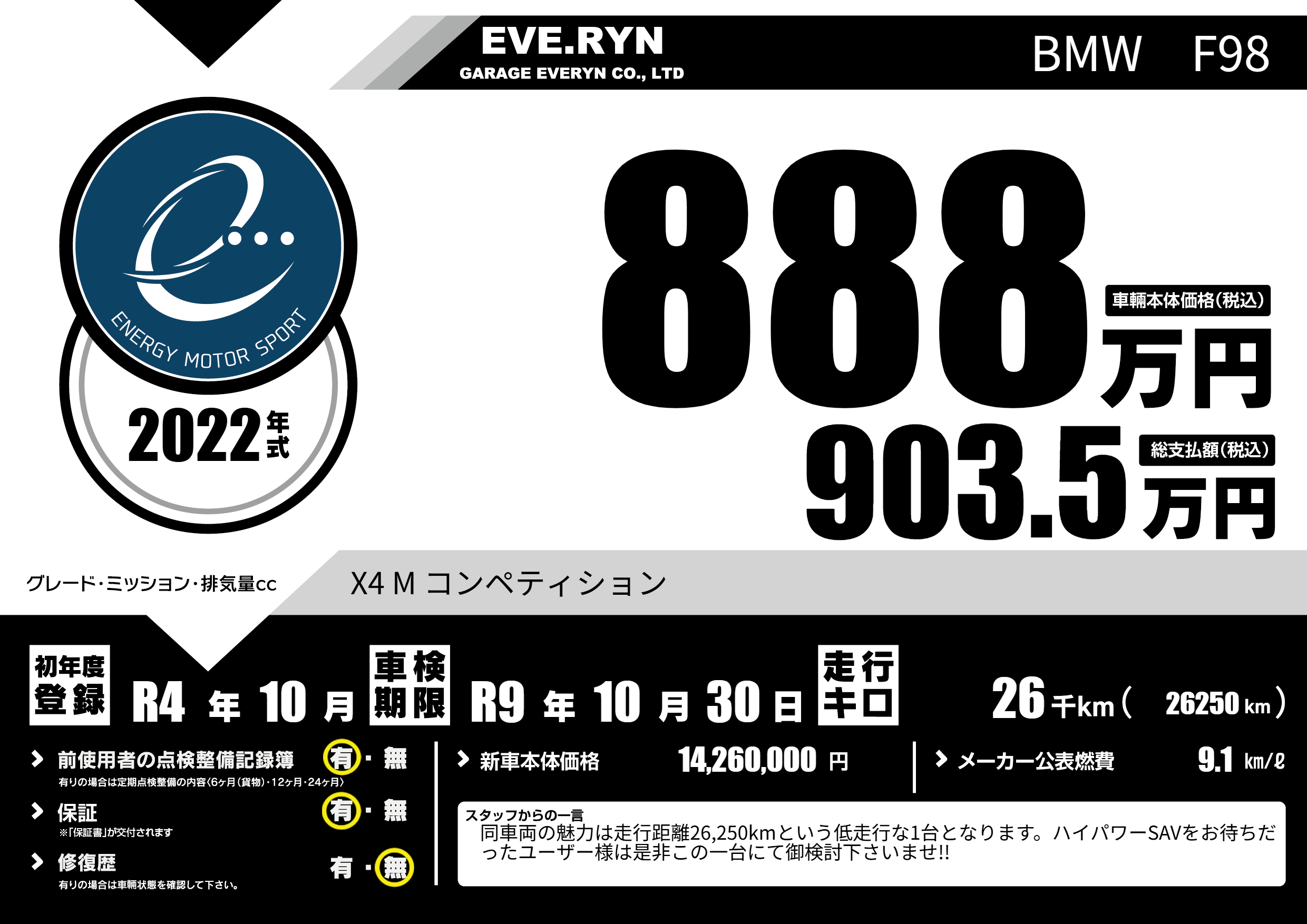 | 車名 | BMW F98 | グレード ミッション 排気量 |