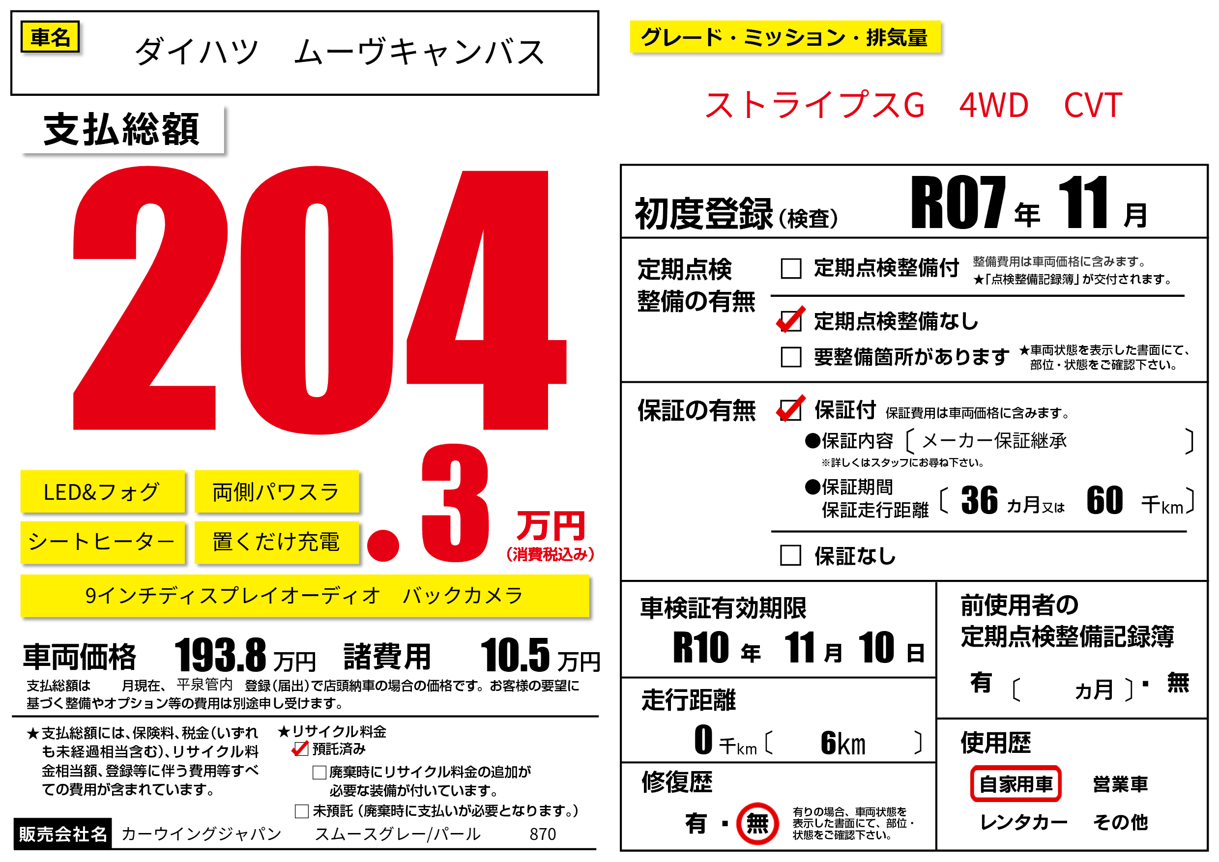 | 走行キロ | - | 初年度登録 | R07年11月 |