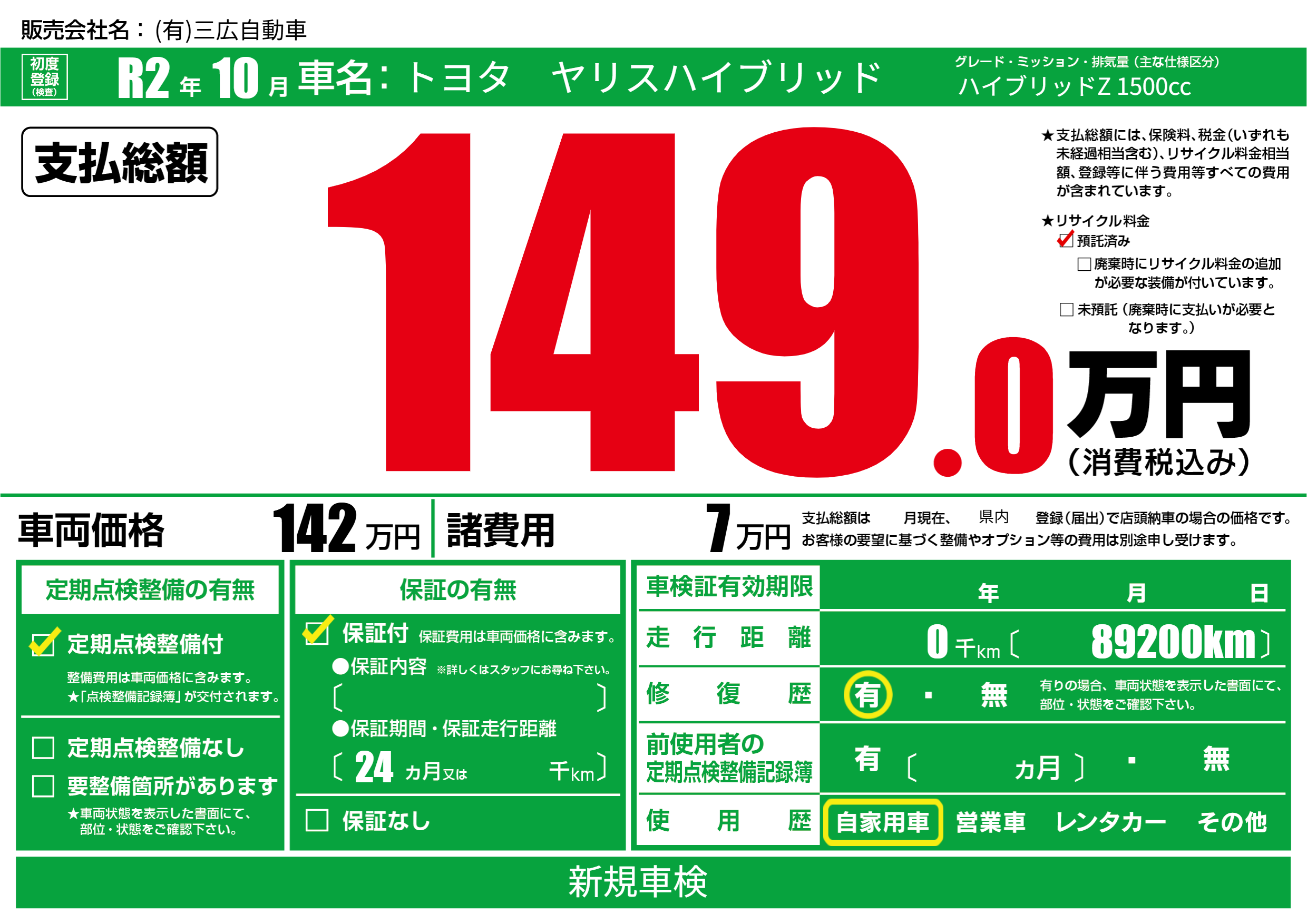 | 車名 | トヨタ ヤリスハイブリッド | グレード ミッション 排気量 |