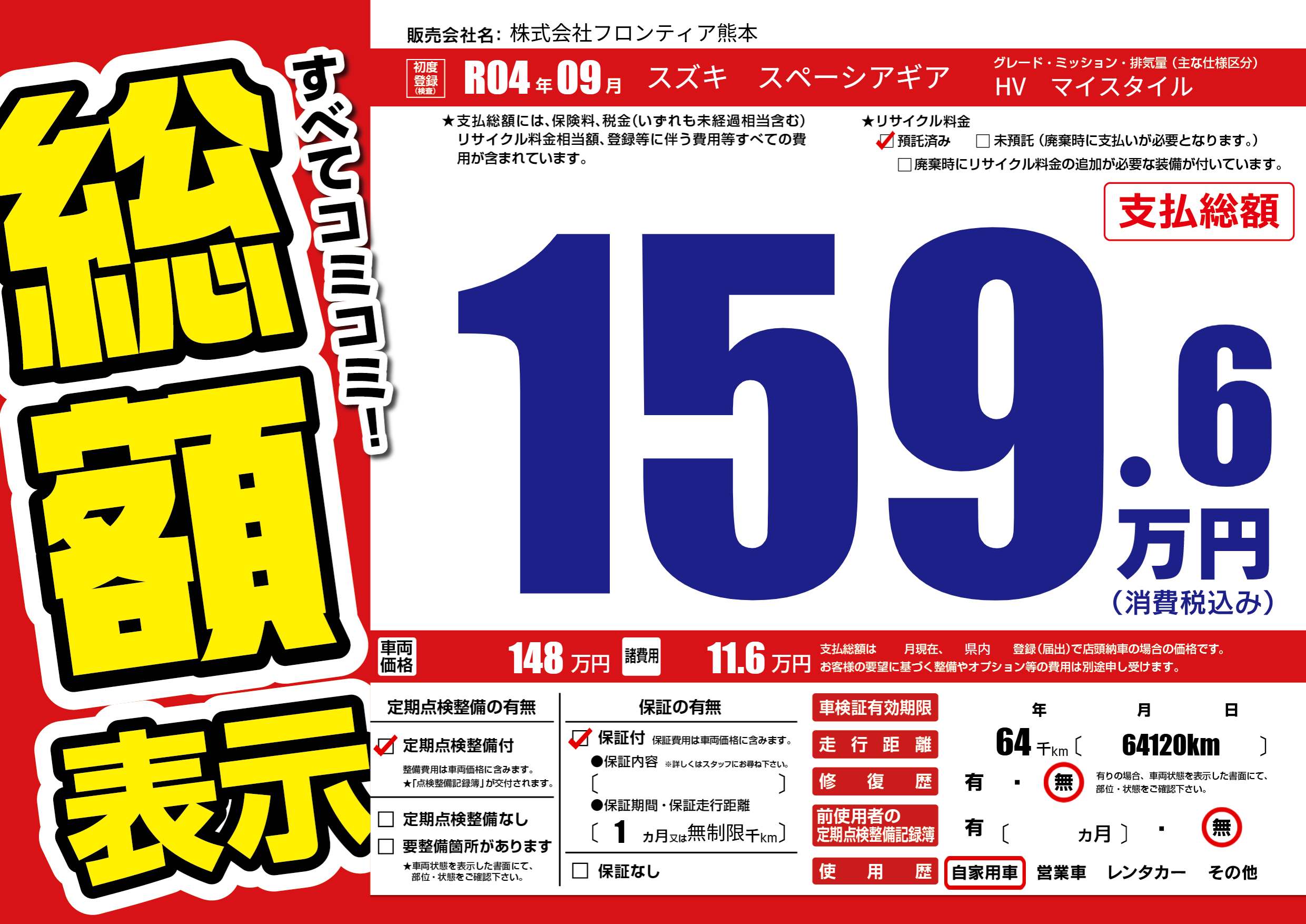 | 走行キロ | 6.4万km | 初年度登録 | R04年09月 |