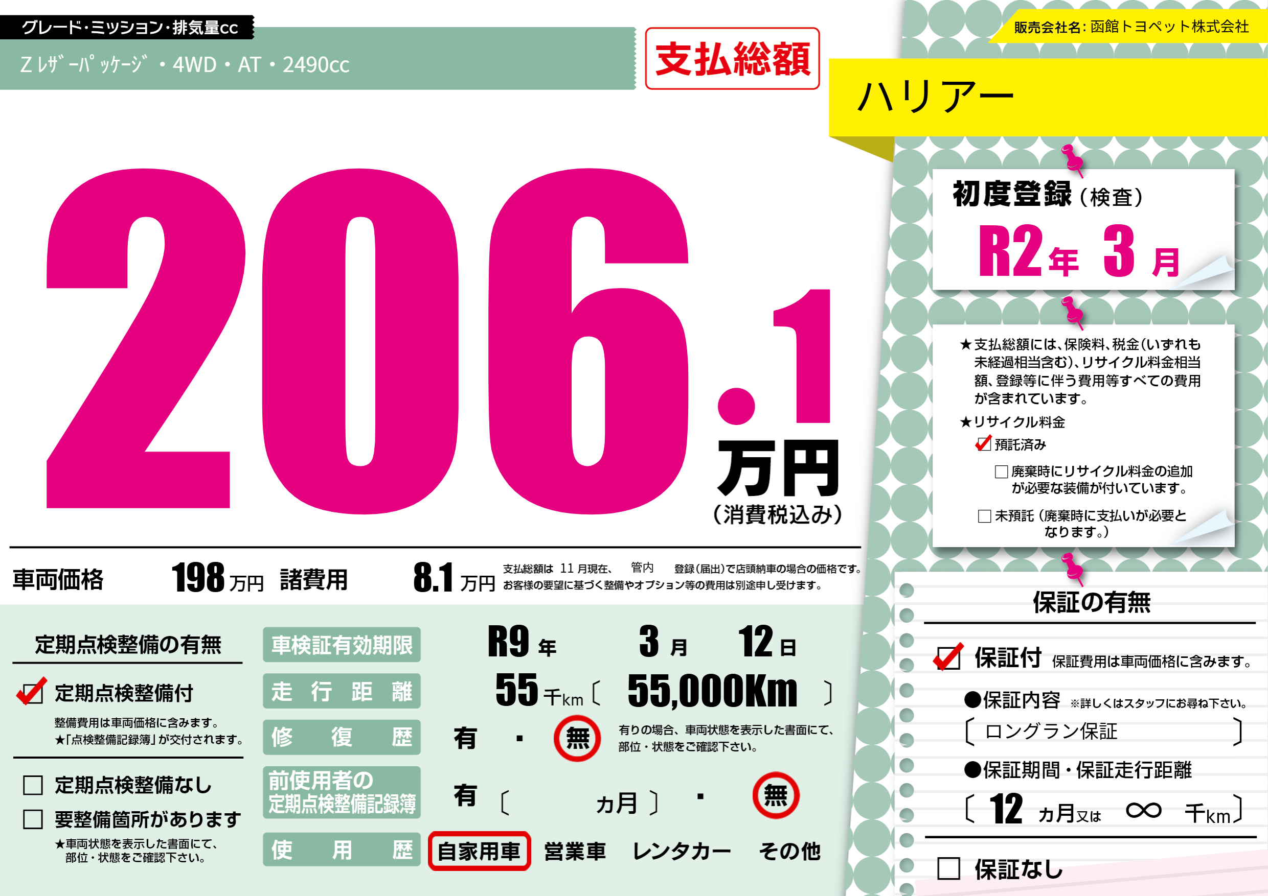 | 車名 | ハリアー | グレード ミッション 排気量 |