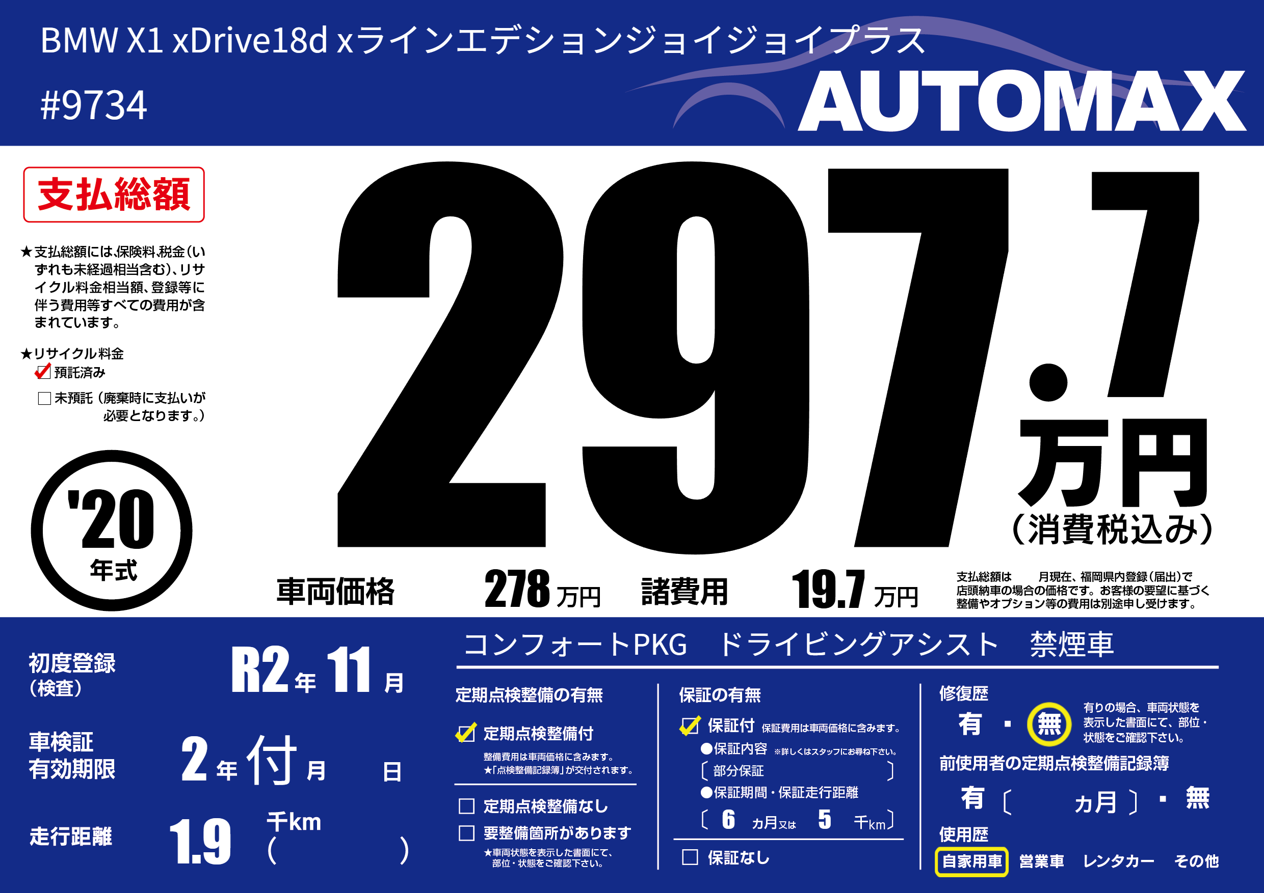 | 車名 | BMW X1 xDrive18d xラインエデションジョイジョイプラス | グレード ミッション 排気量 |