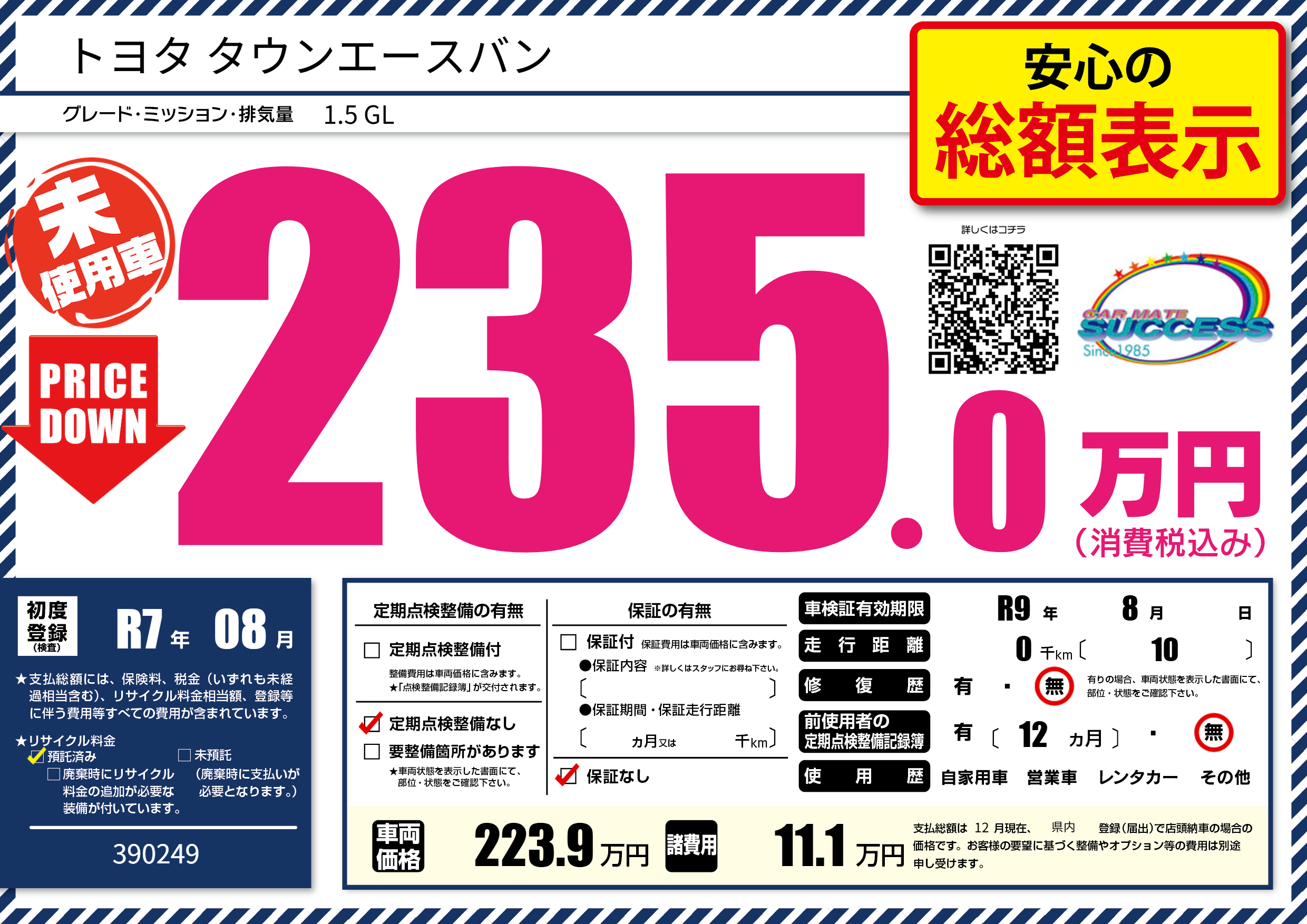 | 車名 | トヨタ タウンエースバン | グレード ミッション 排気量 |