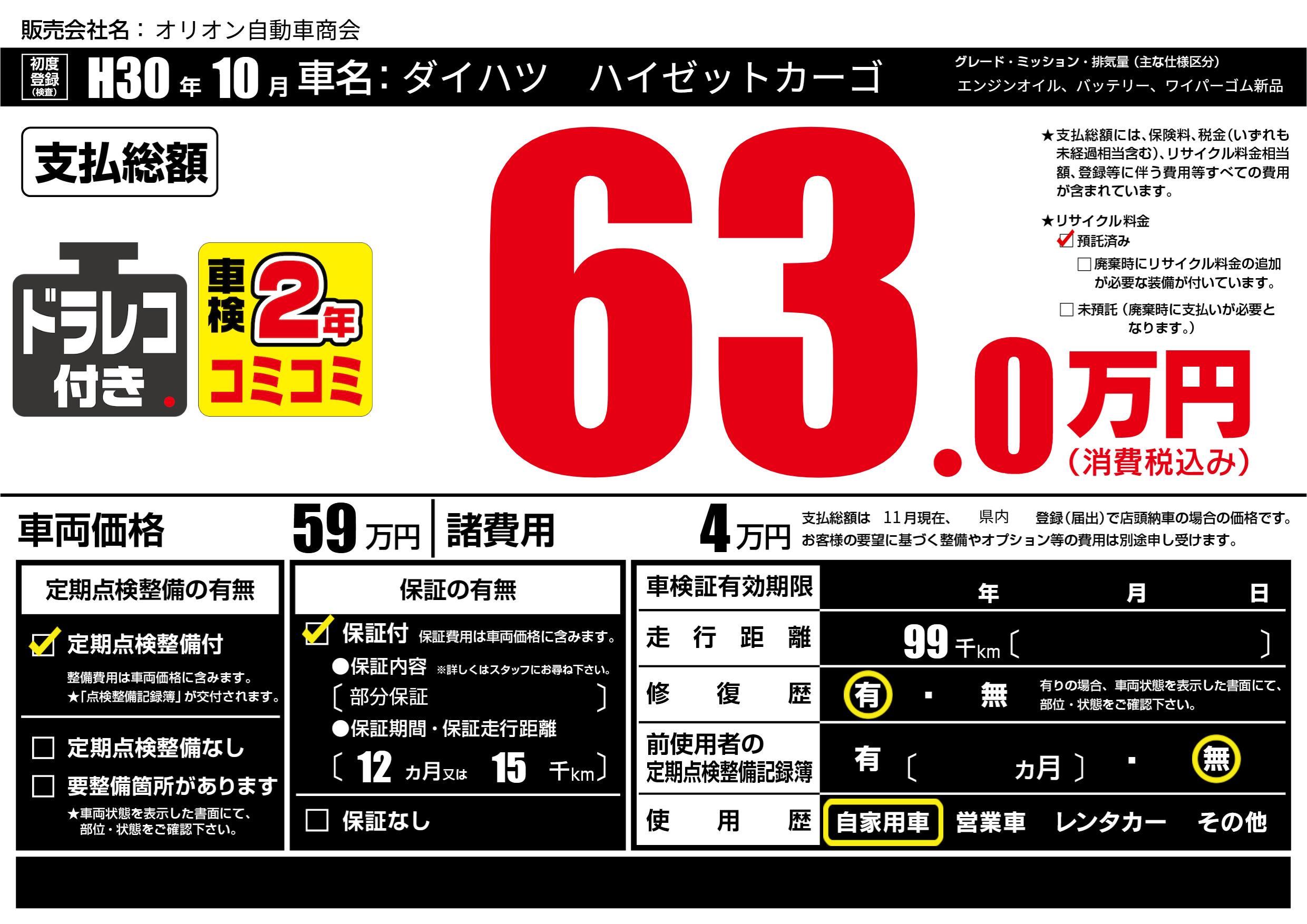 保証付き 保証内容(部分保証) 12ヶ月または(15)千kmまで |