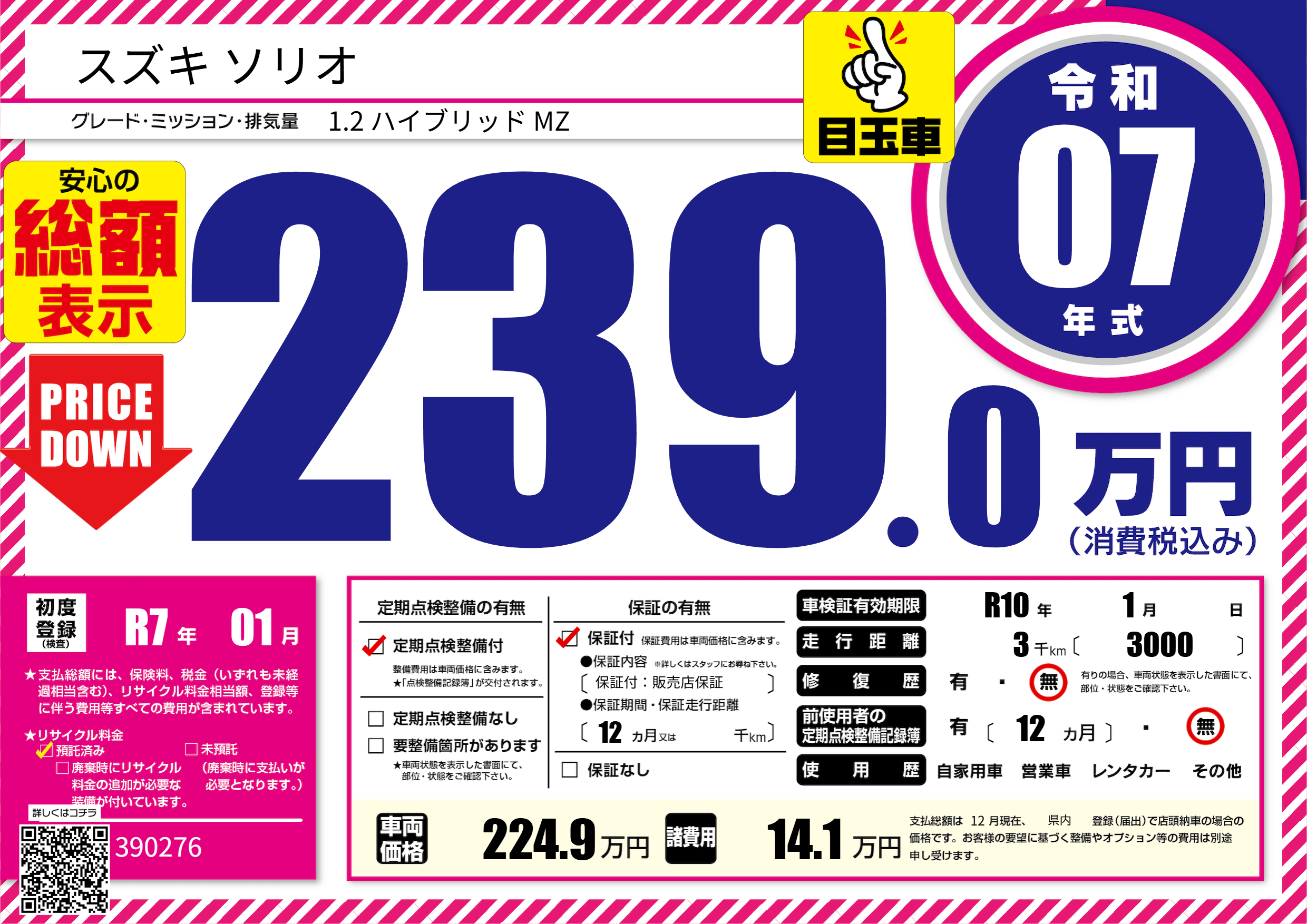 | 走行キロ | 0.3万km | 初年度登録 | R7年01月 |