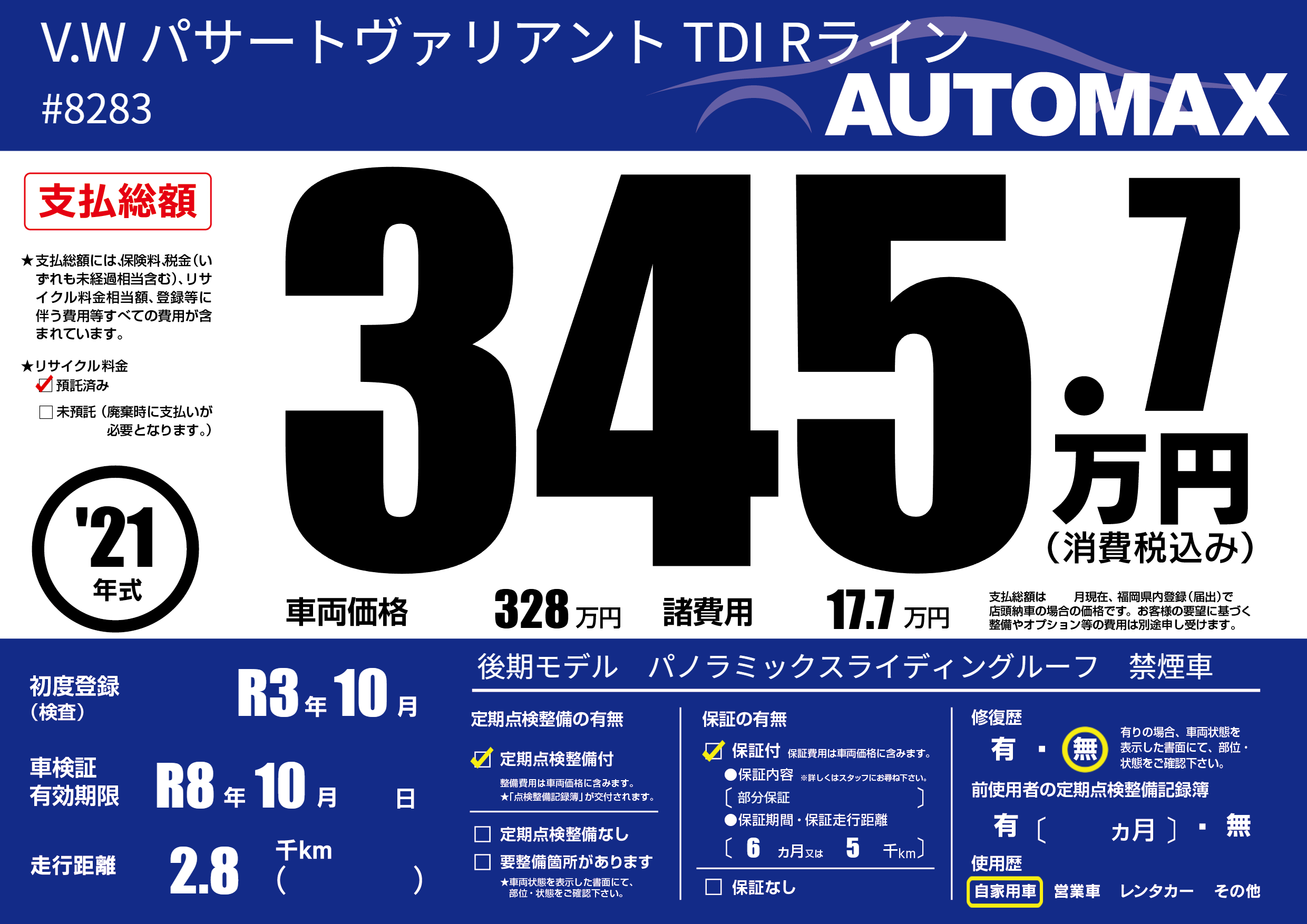 | 車名 | V.W パサートヴァリアント TDI Rライン | グレード ミッション 排気量 |