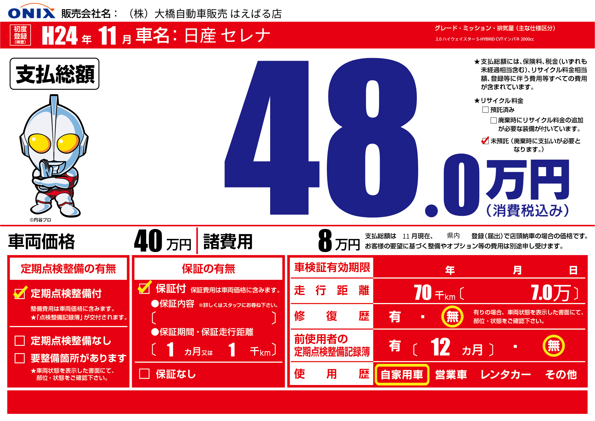 | 走行キロ | 7万km | 初年度登録 | H24年11月 |