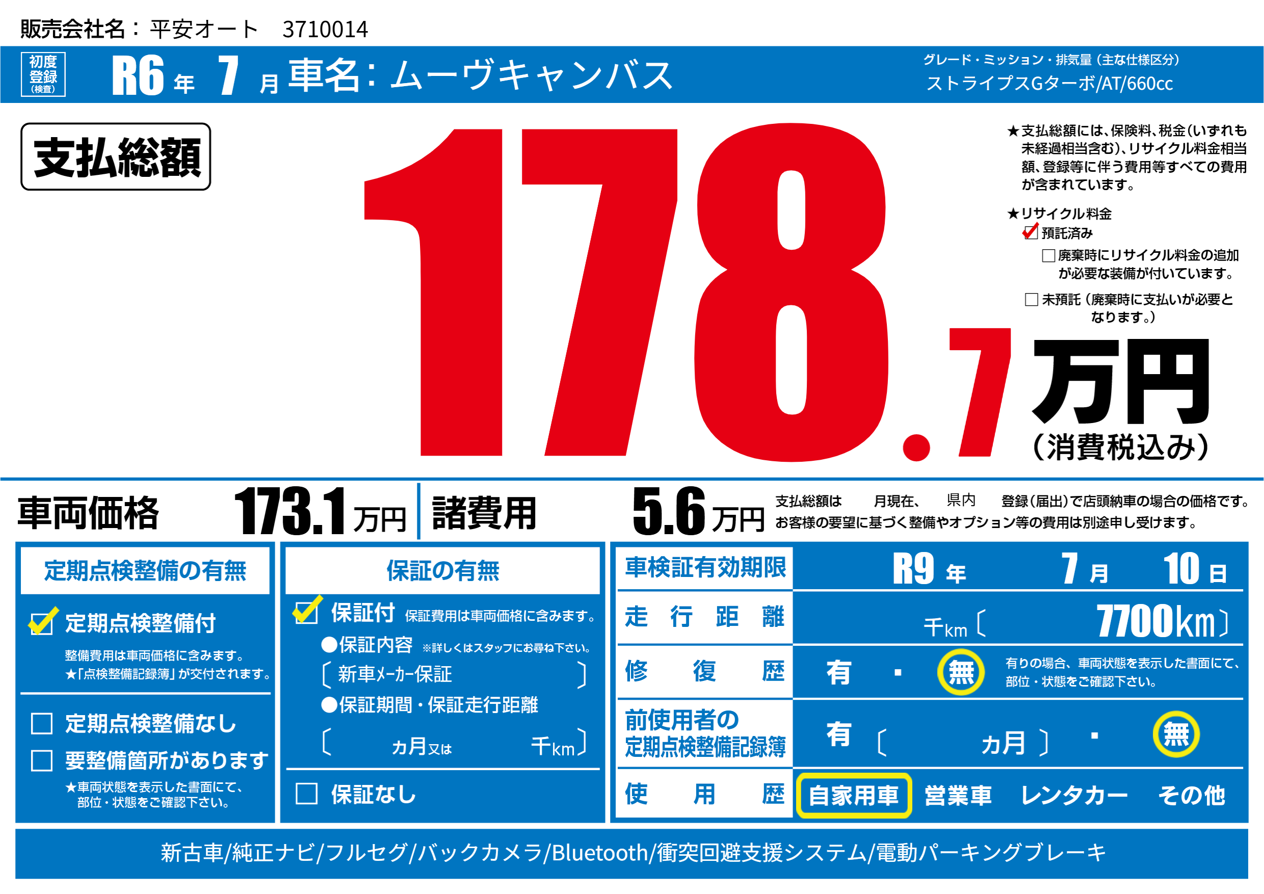 | 走行キロ | - | 初年度登録 | R6年7月 |