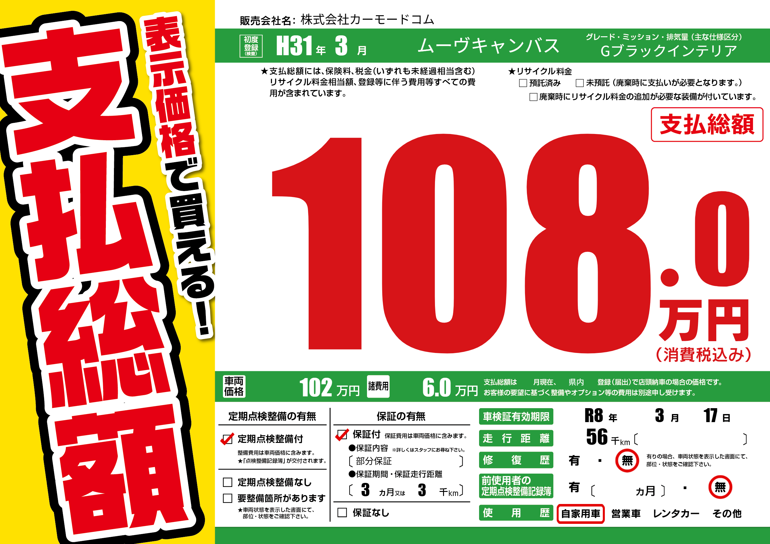 | 車名 | ムーヴキャンバス | グレード ミッション 排気量 |