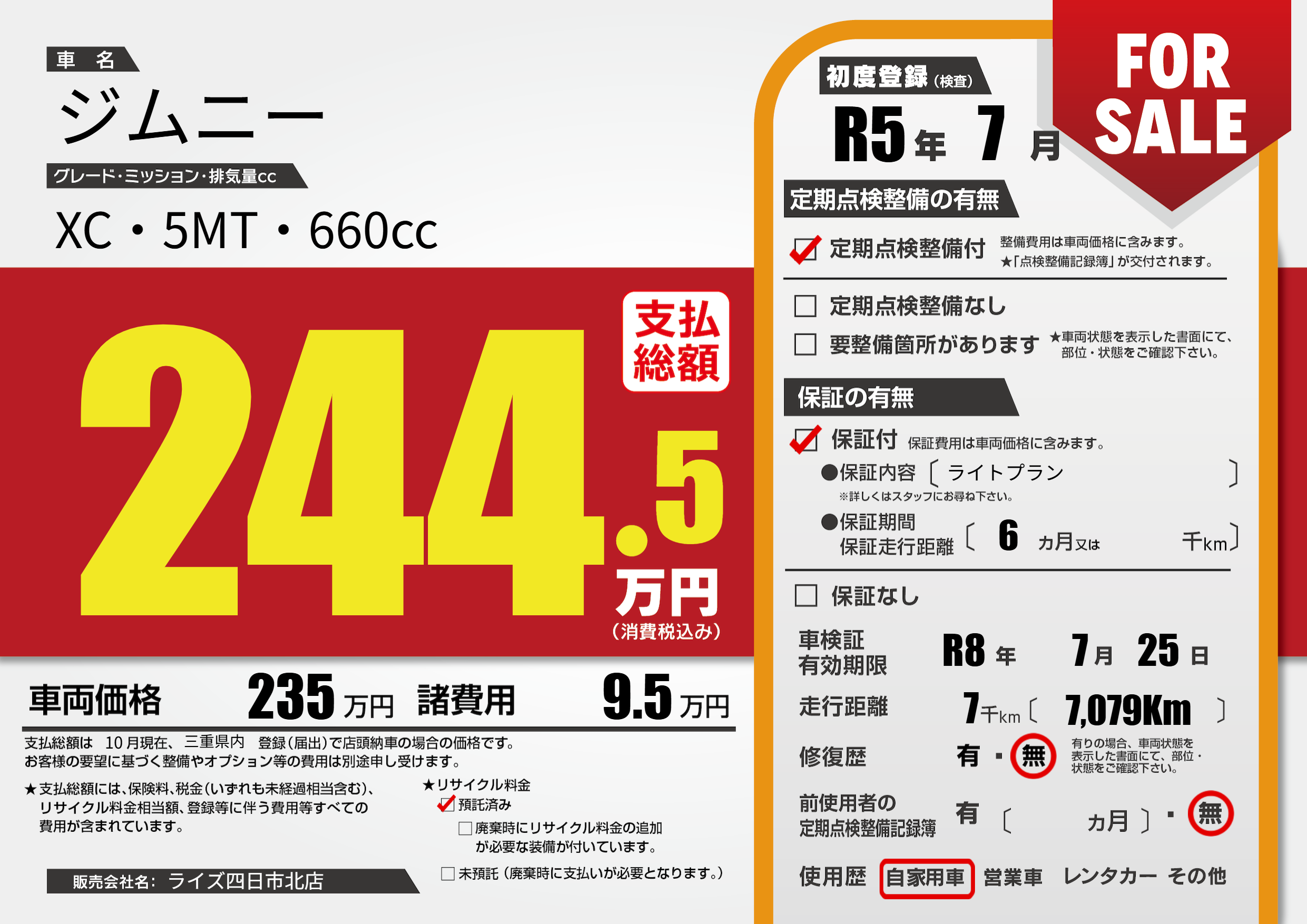 | 車検制限 | R8年 7月 25日 | ||
