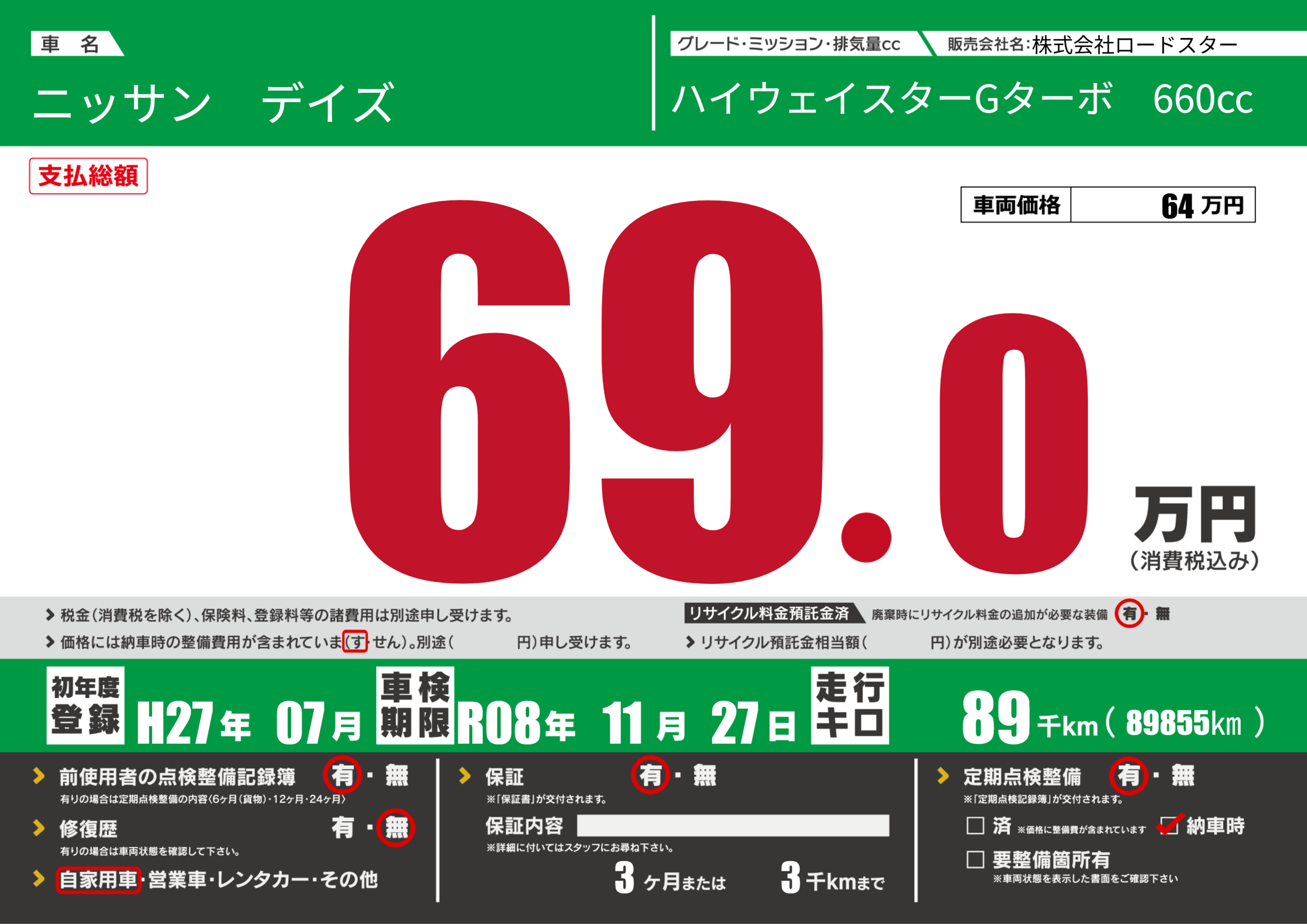 | 定期点検整備 | 定期点検整備あり 納車時あり | ||