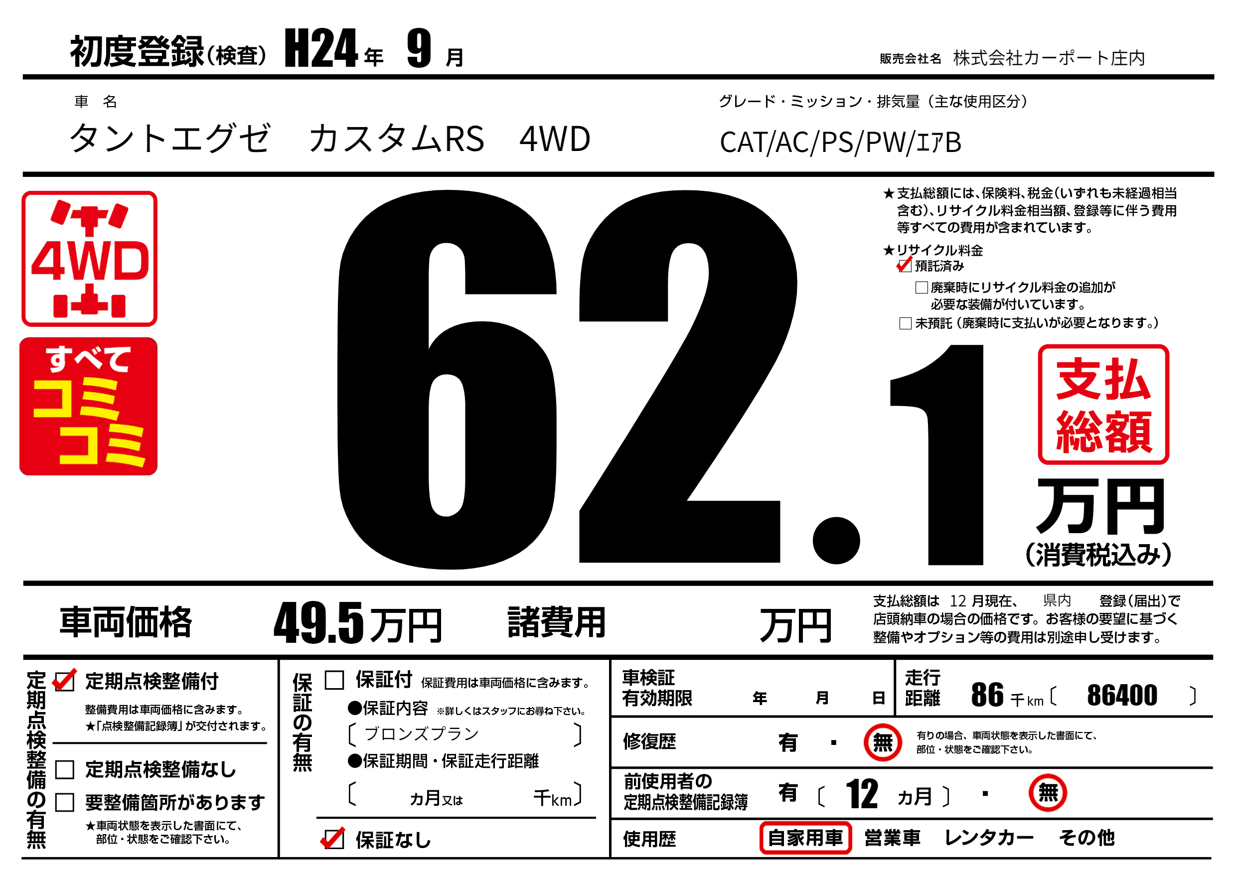 | 車名 | タントエグゼ カスタムRS 4WD | グレード ミッション 排気量 |