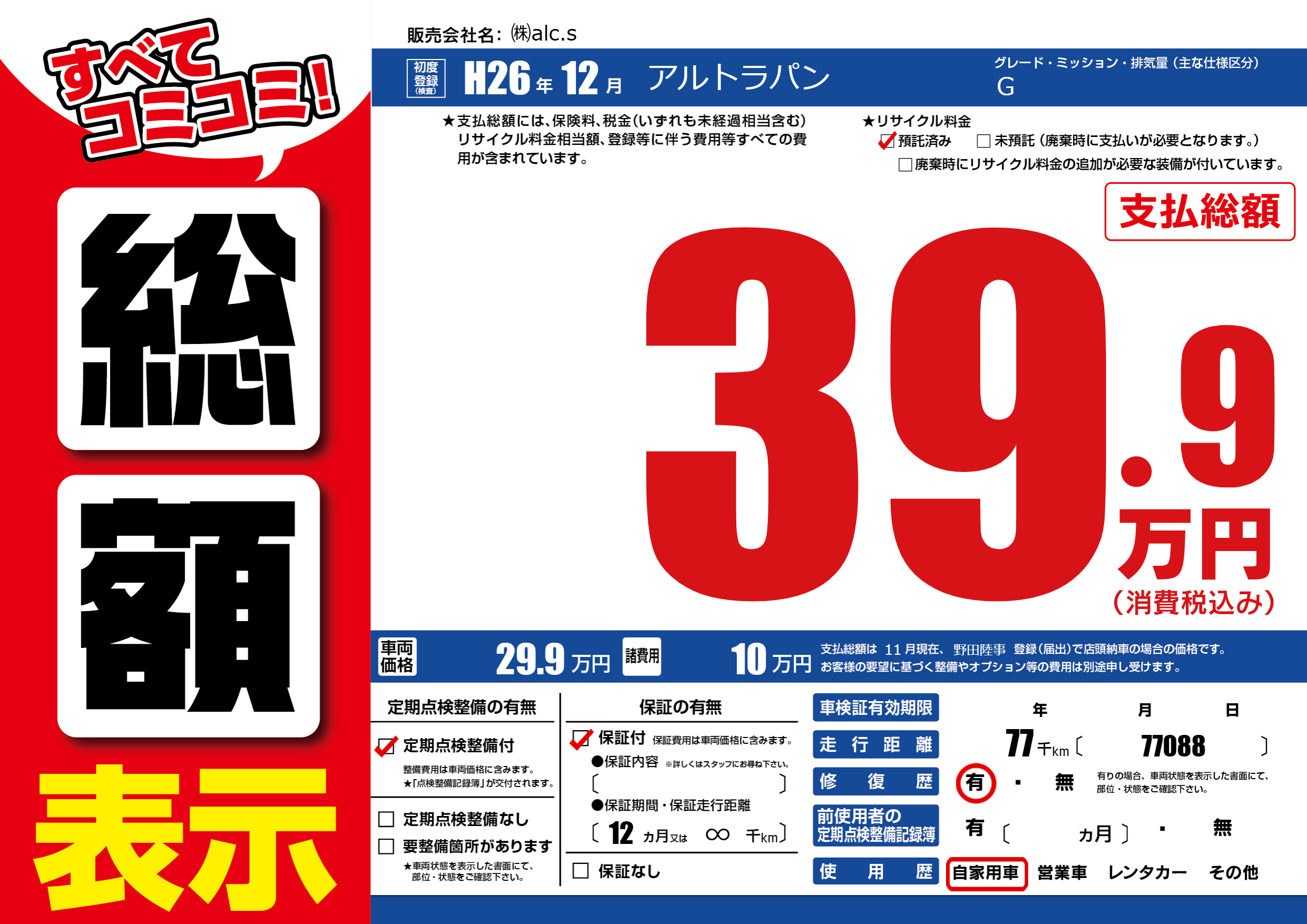 | 走行キロ | 7.7万km | 初年度登録 | H26年12月 |