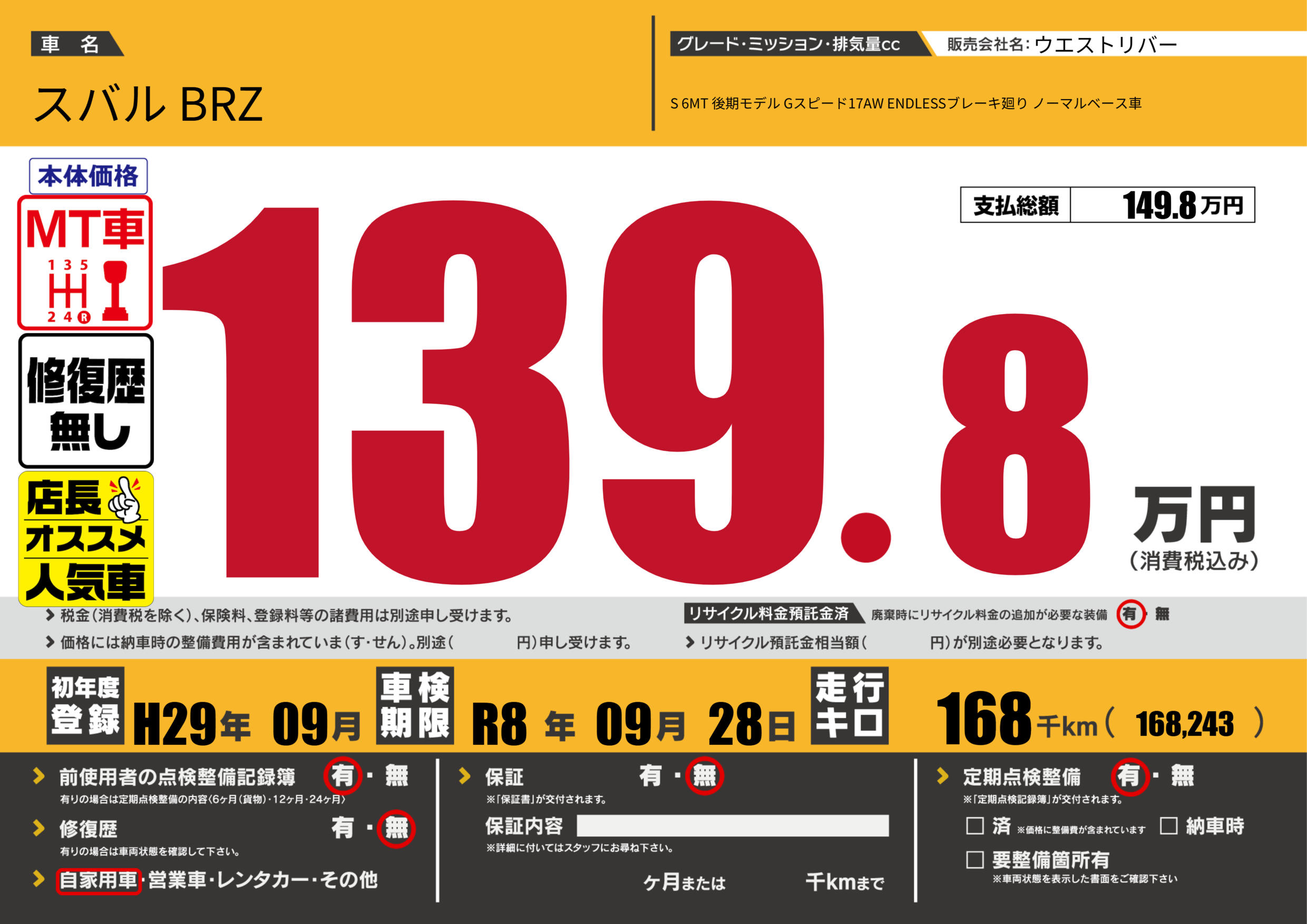 | 車名 | スバル BRZ | グレード ミッション 排気量 |