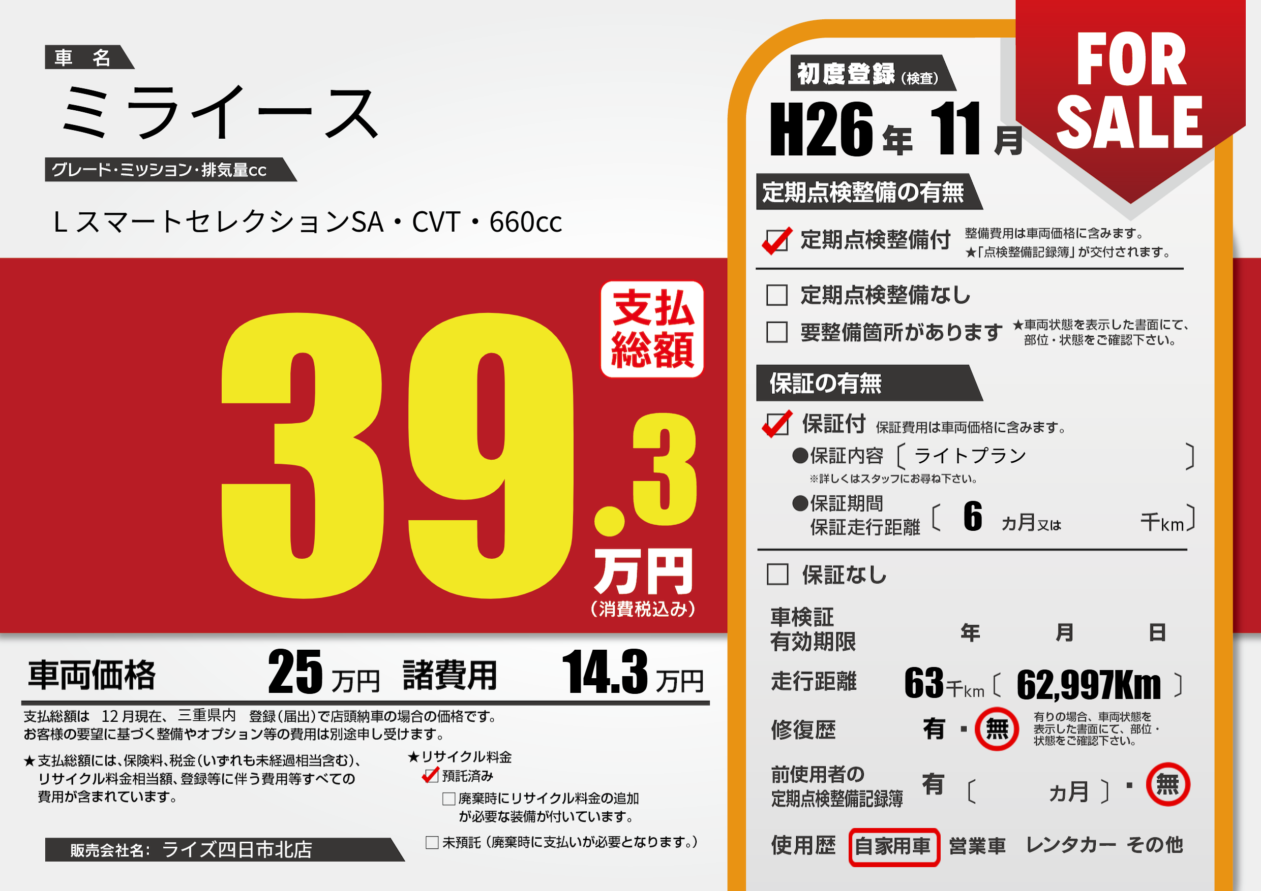 | 車名 | ミライース | グレード ミッション 排気量 |
