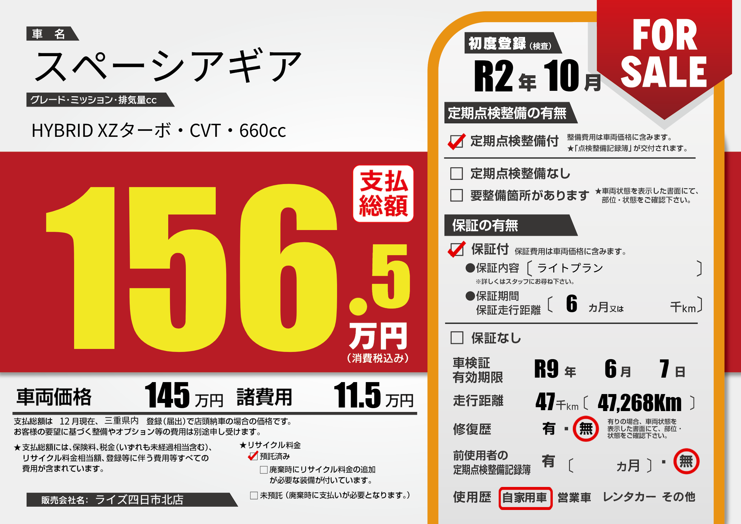 なし | 車検制限 | R9年6月7月 |