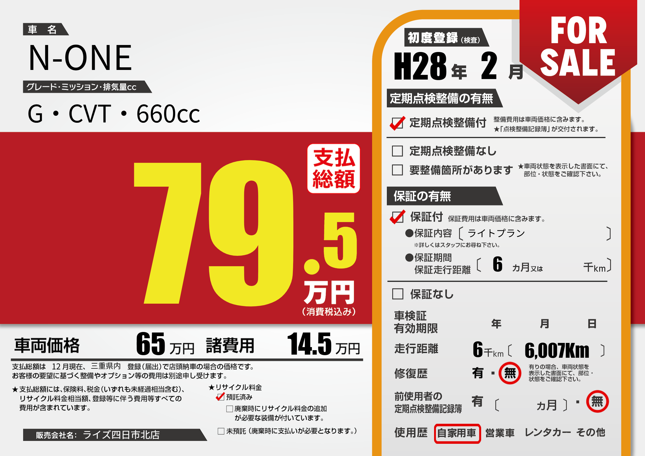 | 車名 | N-ONE | グレード ミッション 排気量 |