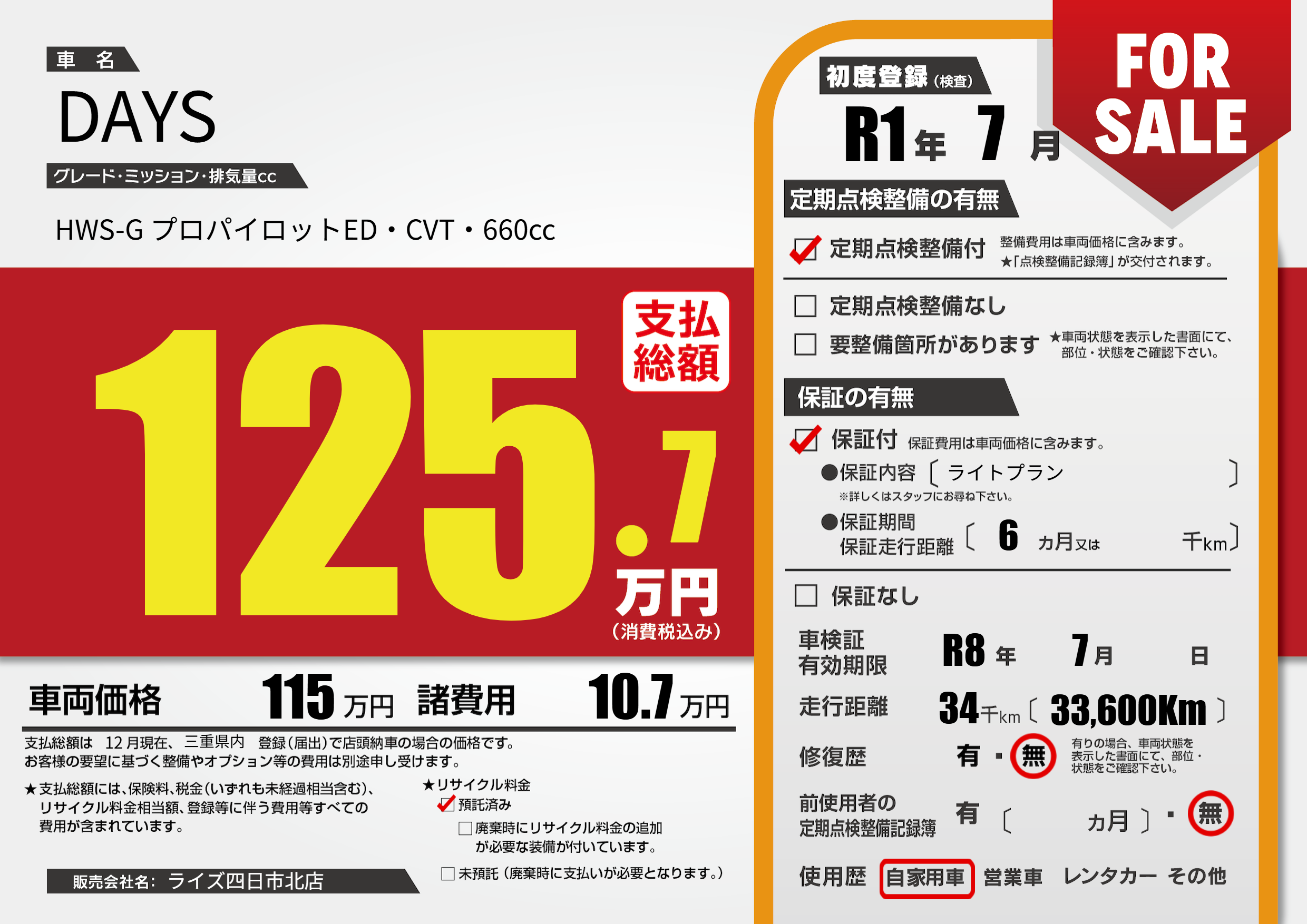 | 車名 | DAYS | グレード ミッション 排気量 |
