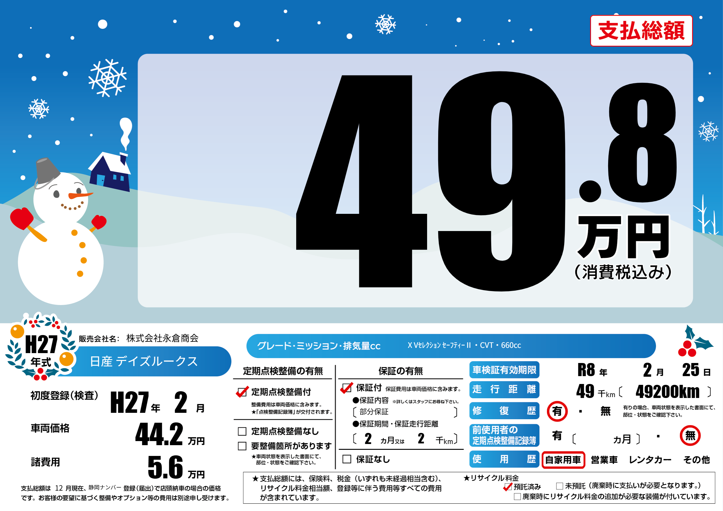 | 走行キロ | 4.9万km | 初年度登録 | H27年2月 |