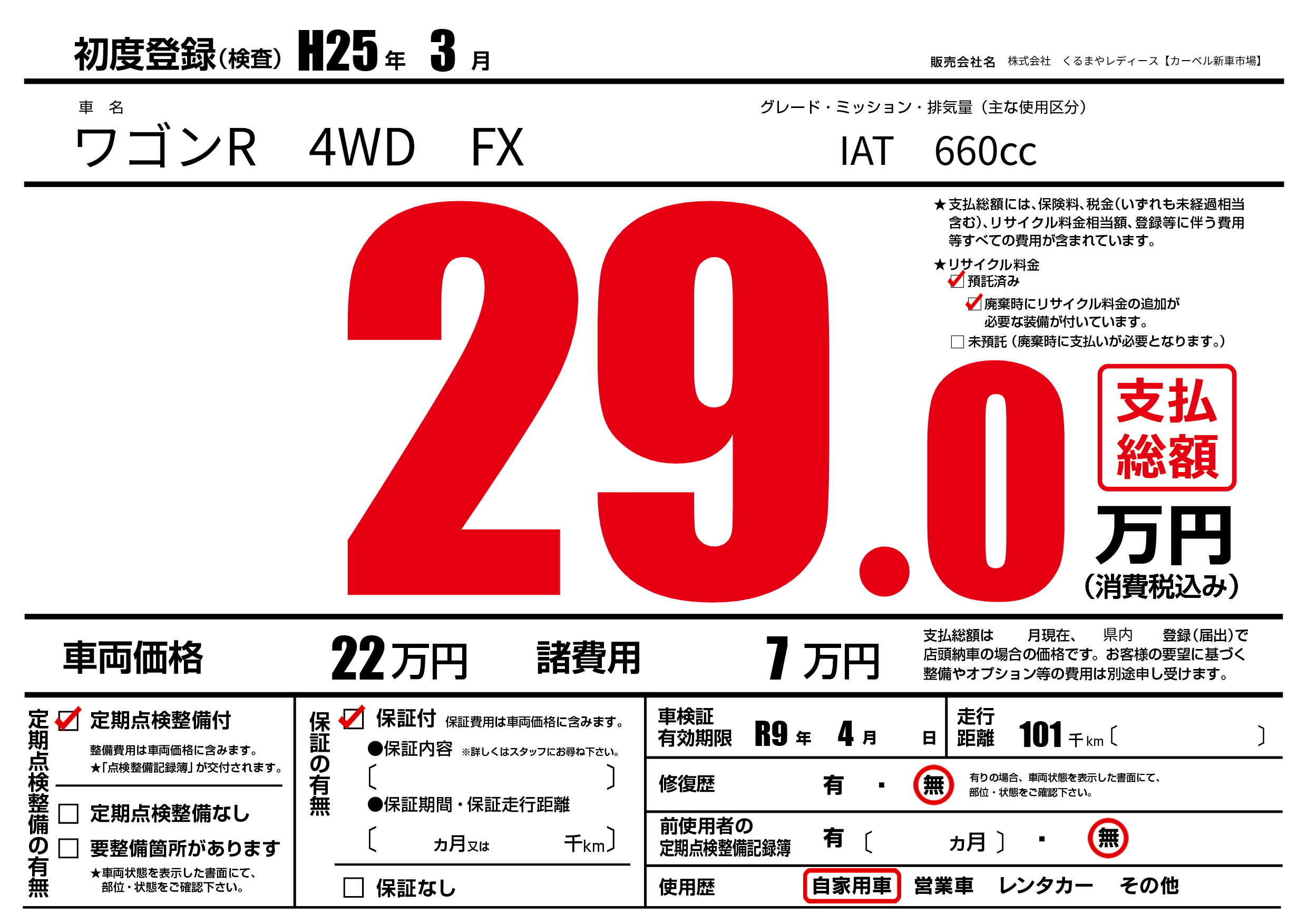 | 車名 | ワゴンR 4WD FX | グレード ミッション 排気量 |