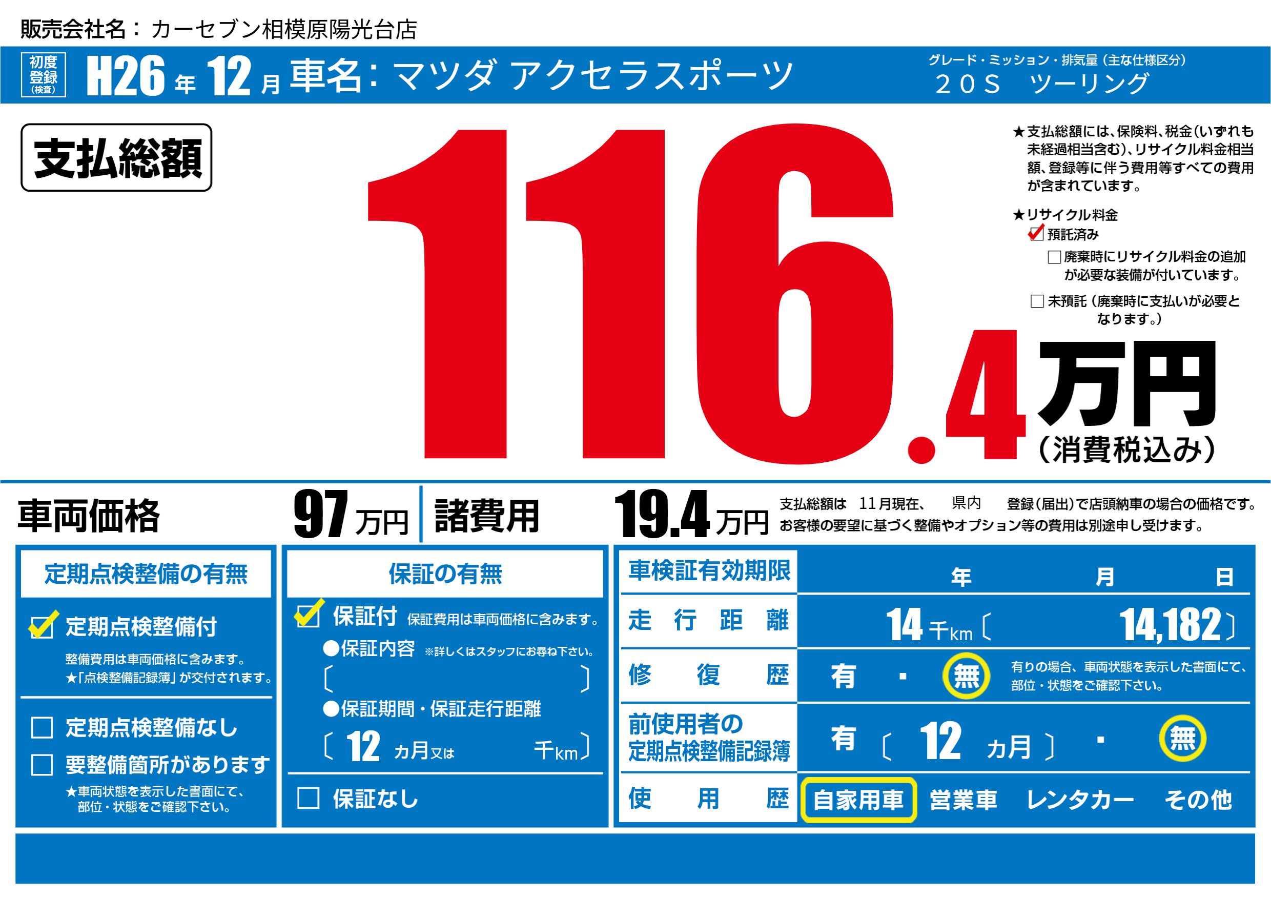 | 走行キロ | 1.4万km | 初年度登録 | H26年12月 |