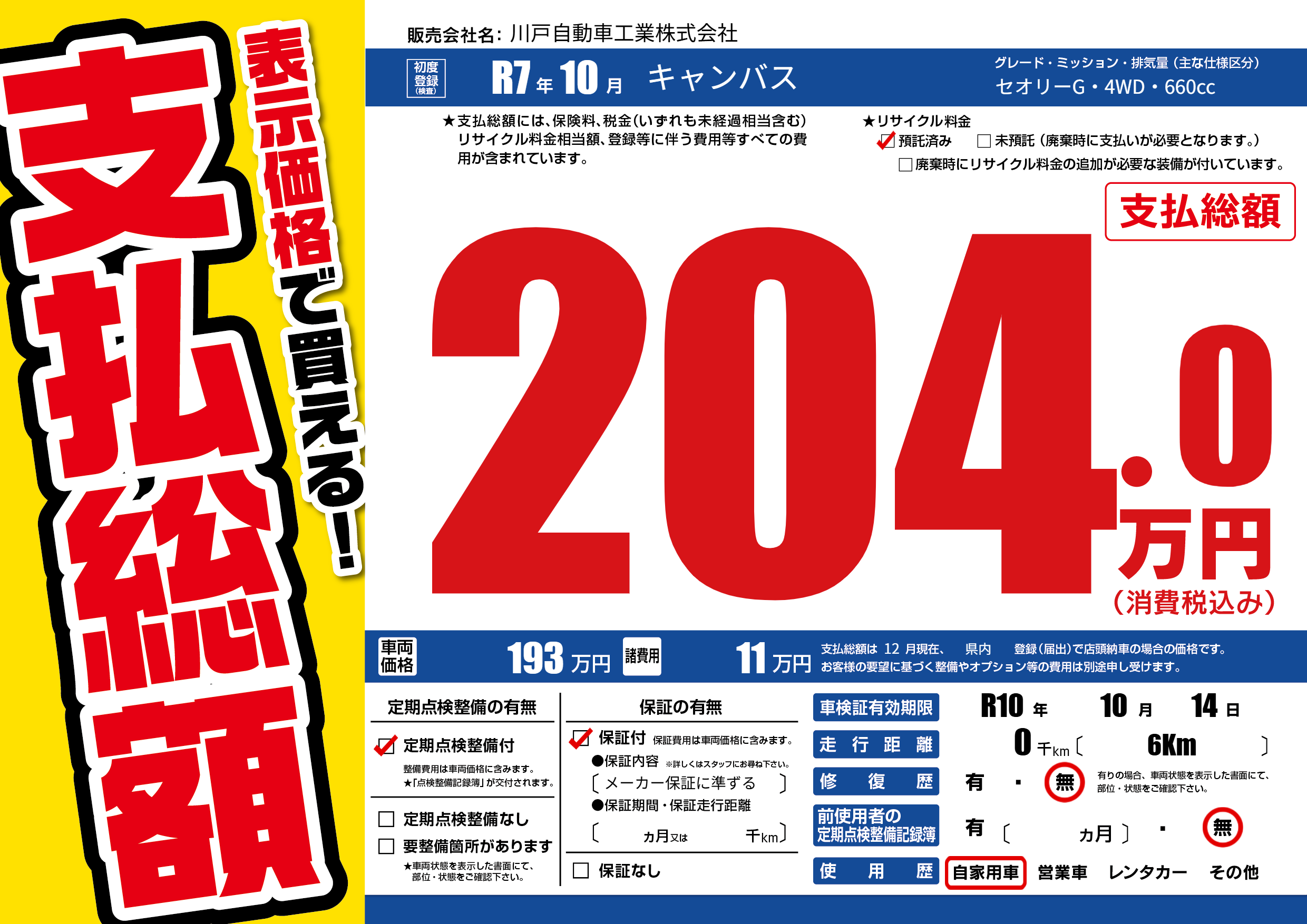 | 走行キロ | - | 初年度登録 | R7年10月 |