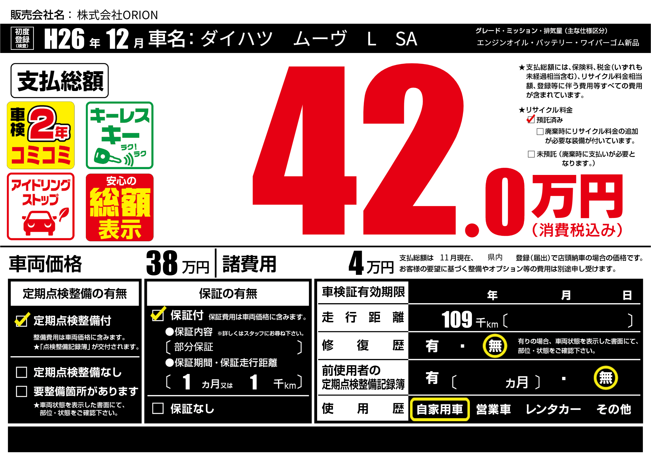 | 走行キロ | 10.9万km | 初年度登録 | H26年12月 |