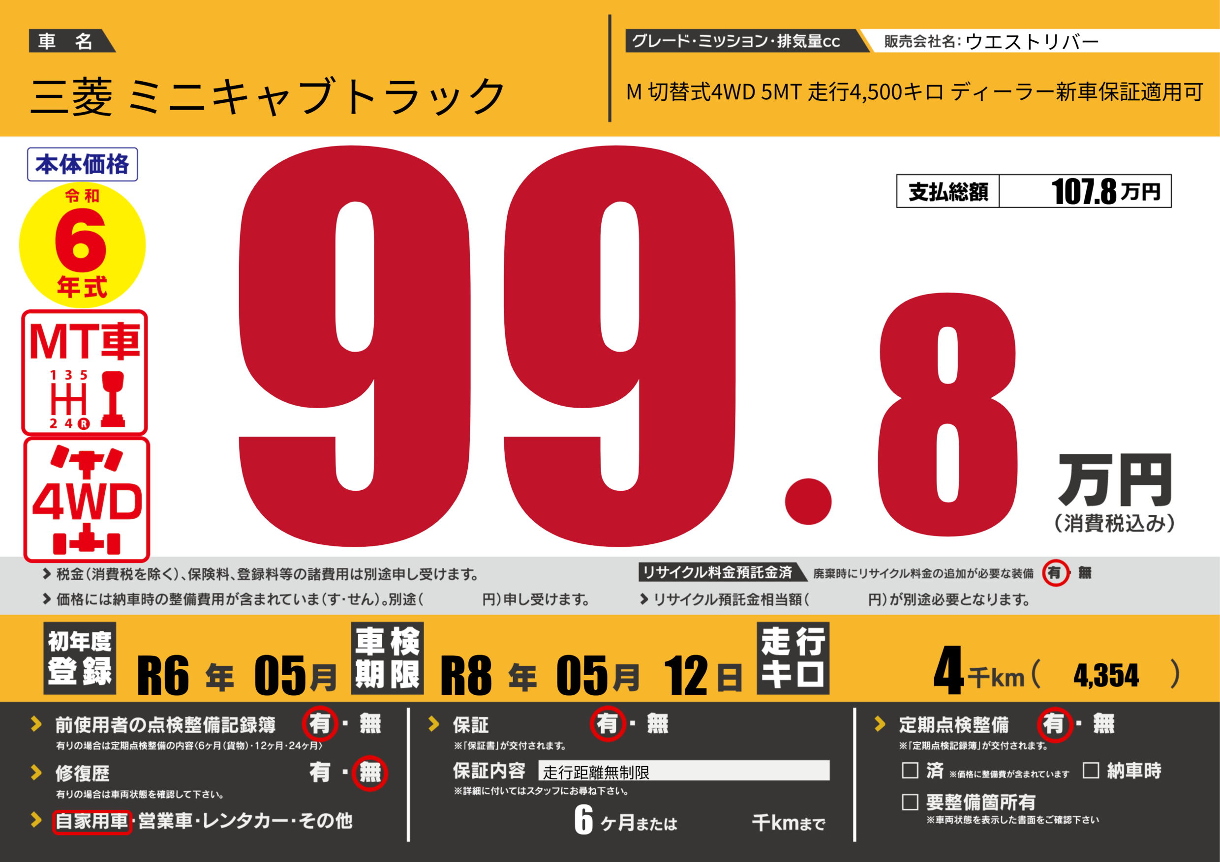 M 切替式4WD 5MT 走行4,500キロ ディーラー新車保証適用可 |