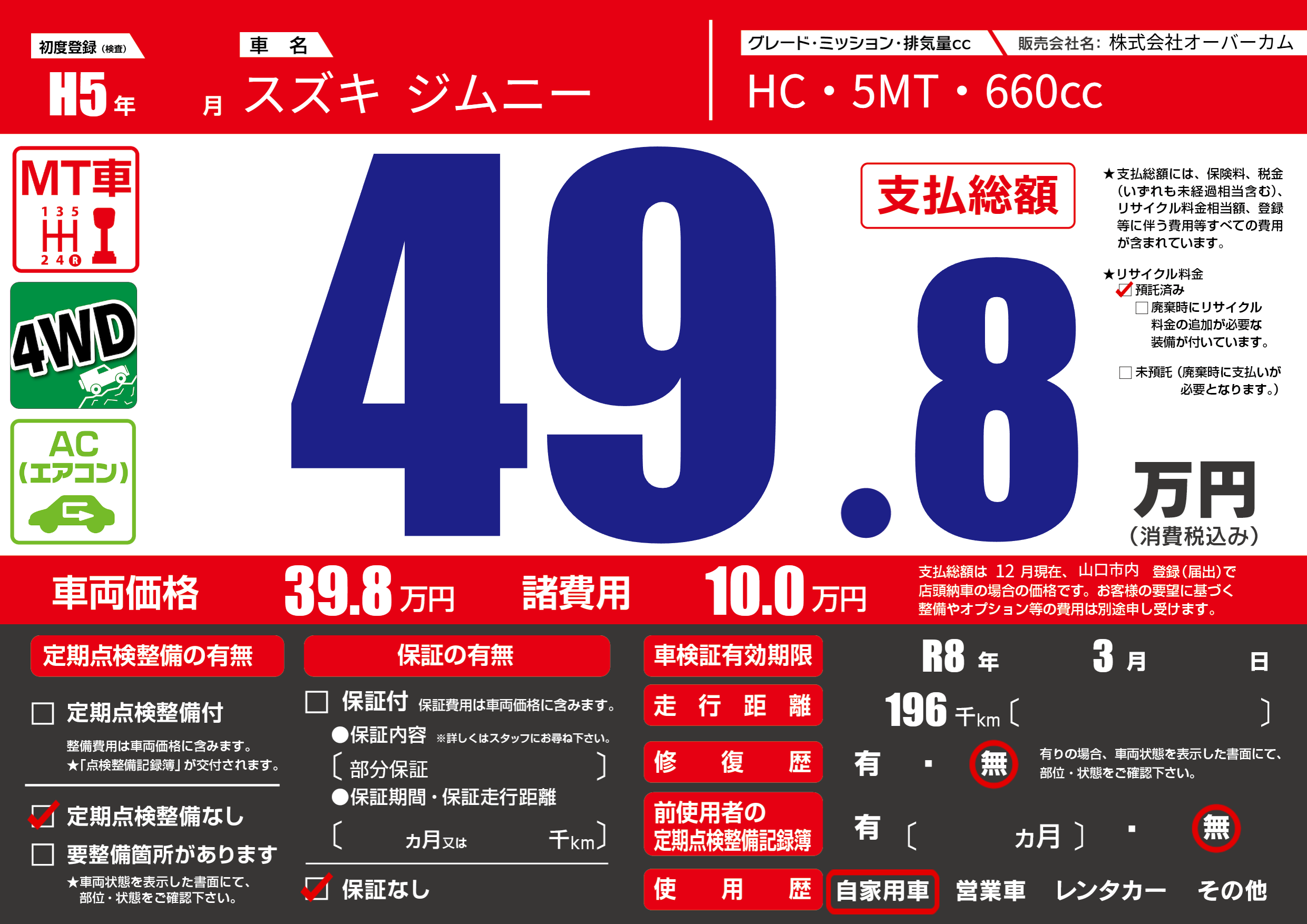 | 走行キロ | 19.6万km | 初年度登録 | H5年---月 |