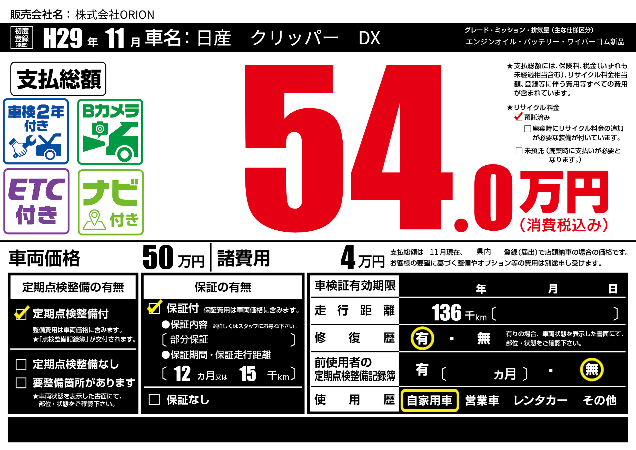 保証付き 保証内容(部分保証) 12ヶ月または(15)千kmまで |