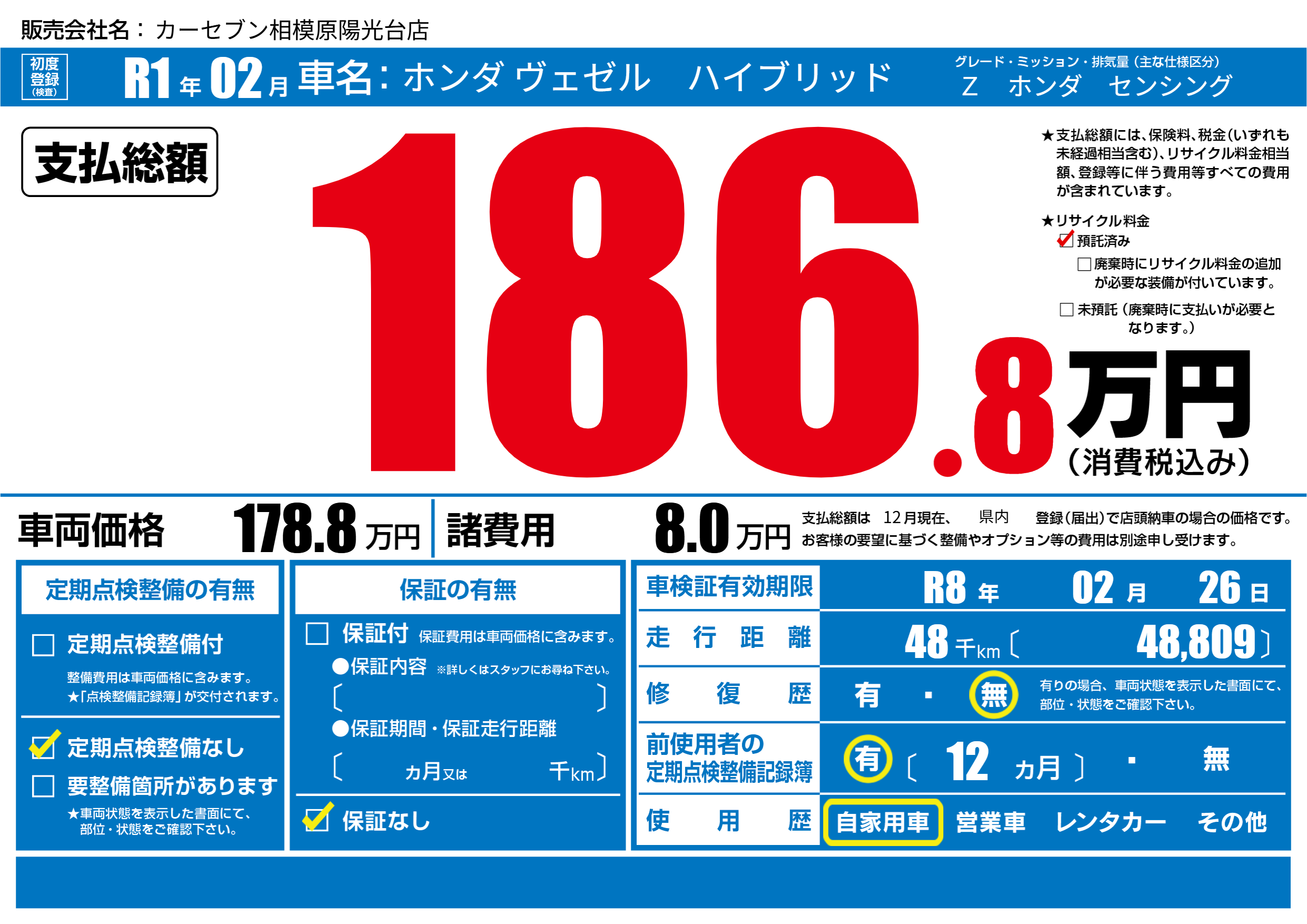 | 車名 | ホンダ ヴェゼル ハイブリッド | グレード ミッション 排気量 |