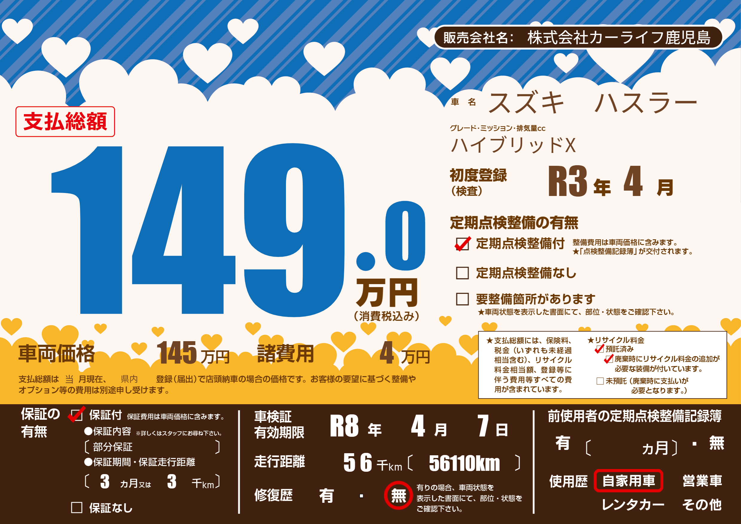| 走行キロ | 0.5万km | 初年度登録 | R3年4月 |
