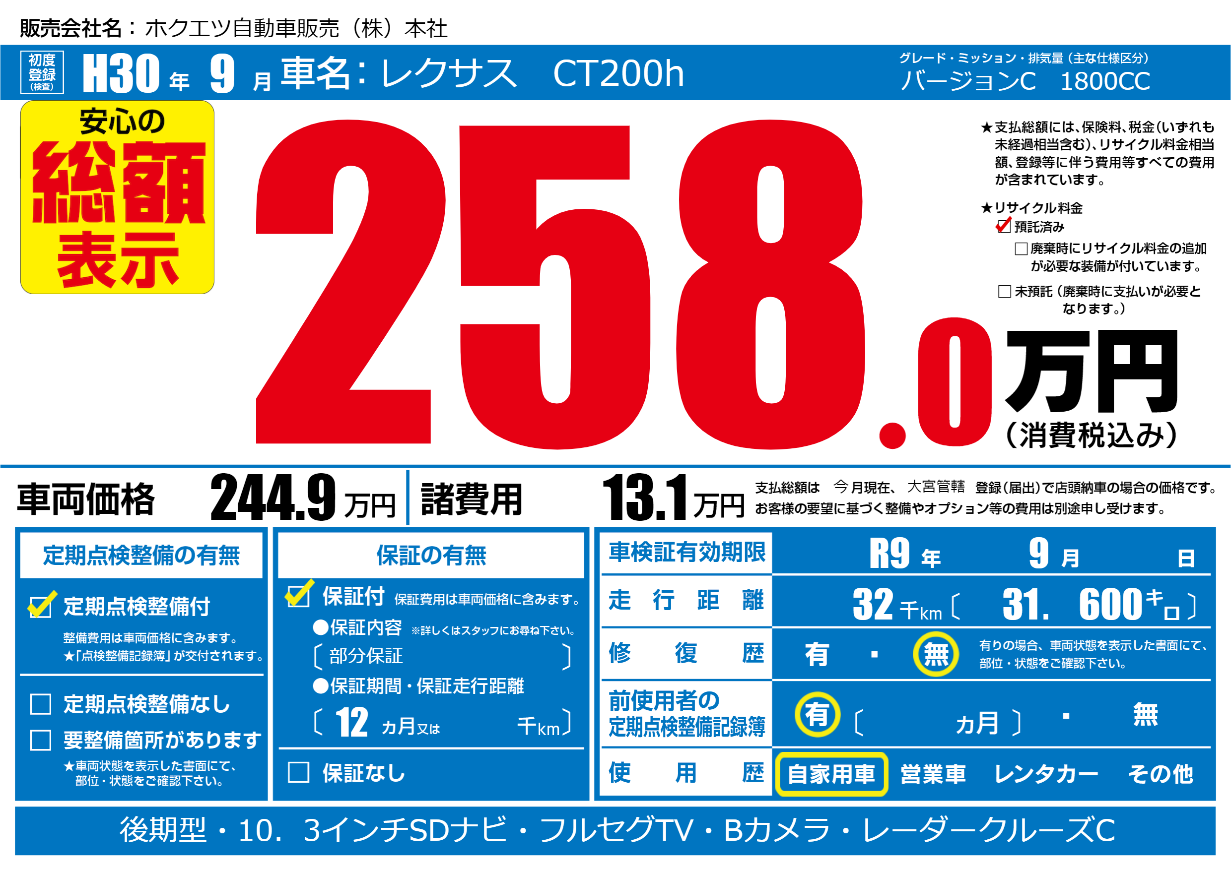 | 車名 | レクサス CT200h | グレード ミッション 排気量 |