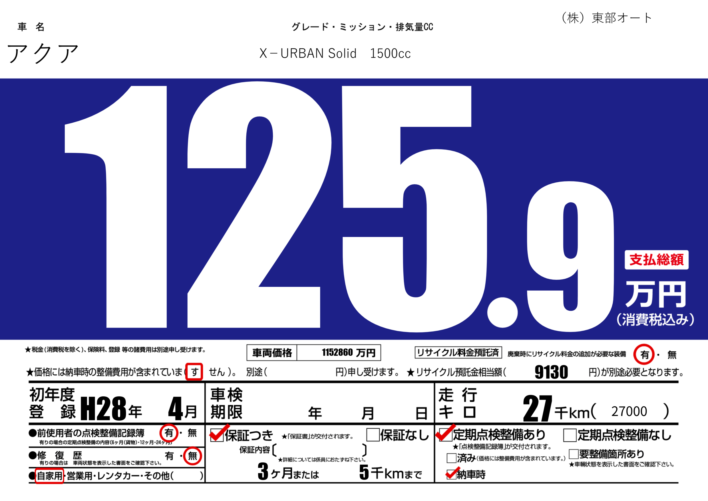 | 定期点検整備 | 定期点検整備あり 納車時あり | ||