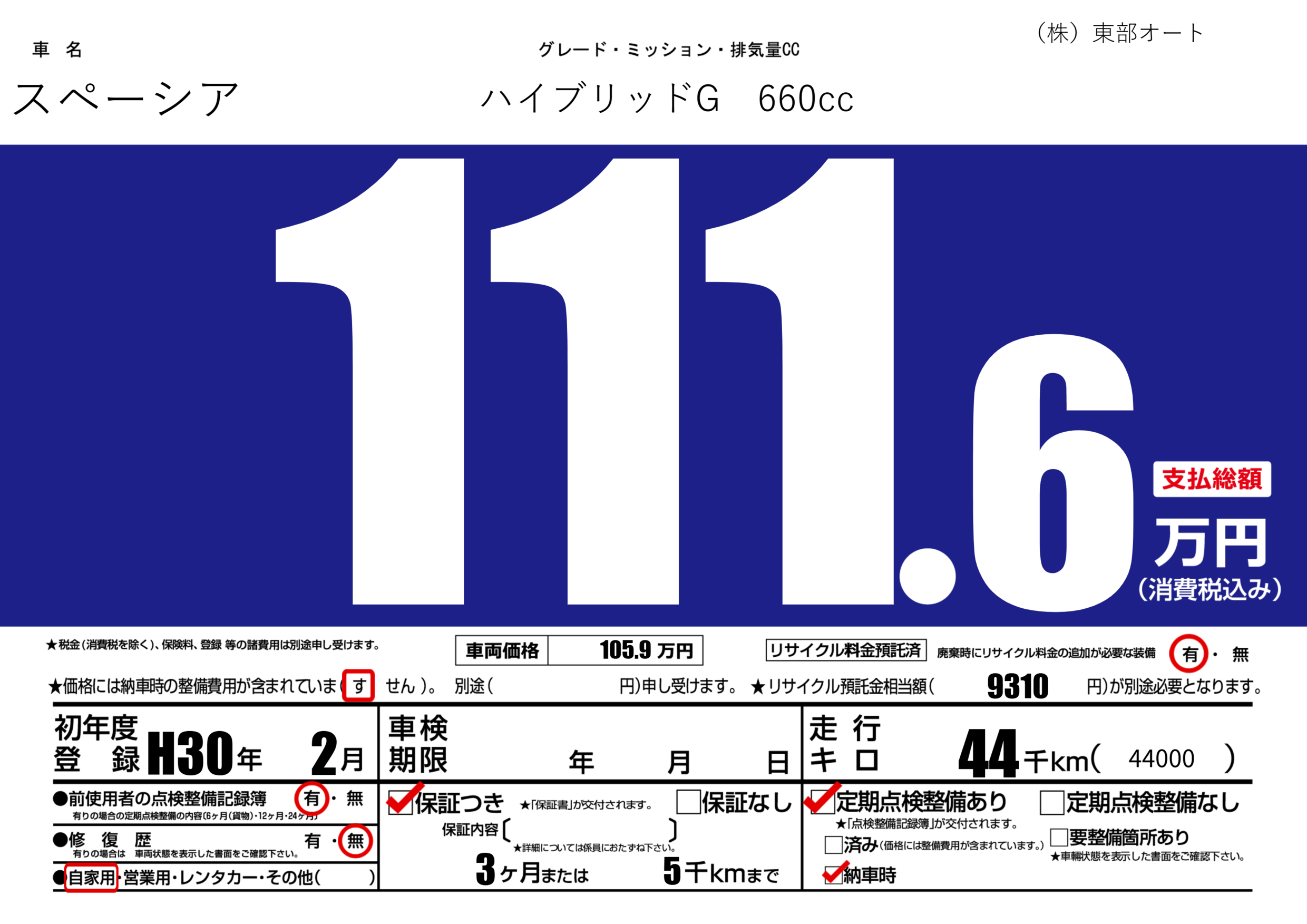 | 定期点検整備 | 定期点検整備あり 納車時あり | ||