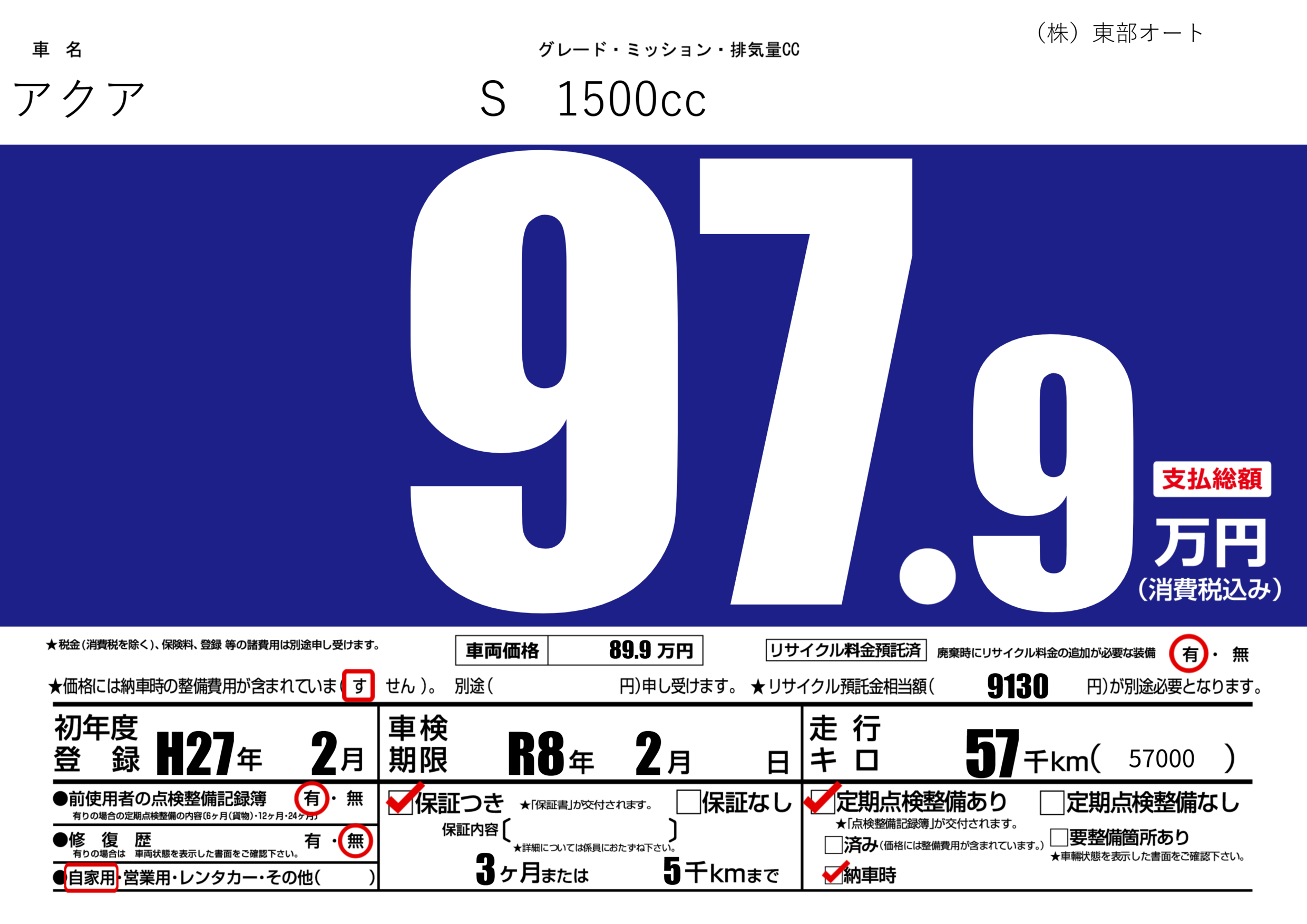 | 定期点検整備 | 定期点検整備あり 納車時あり | ||