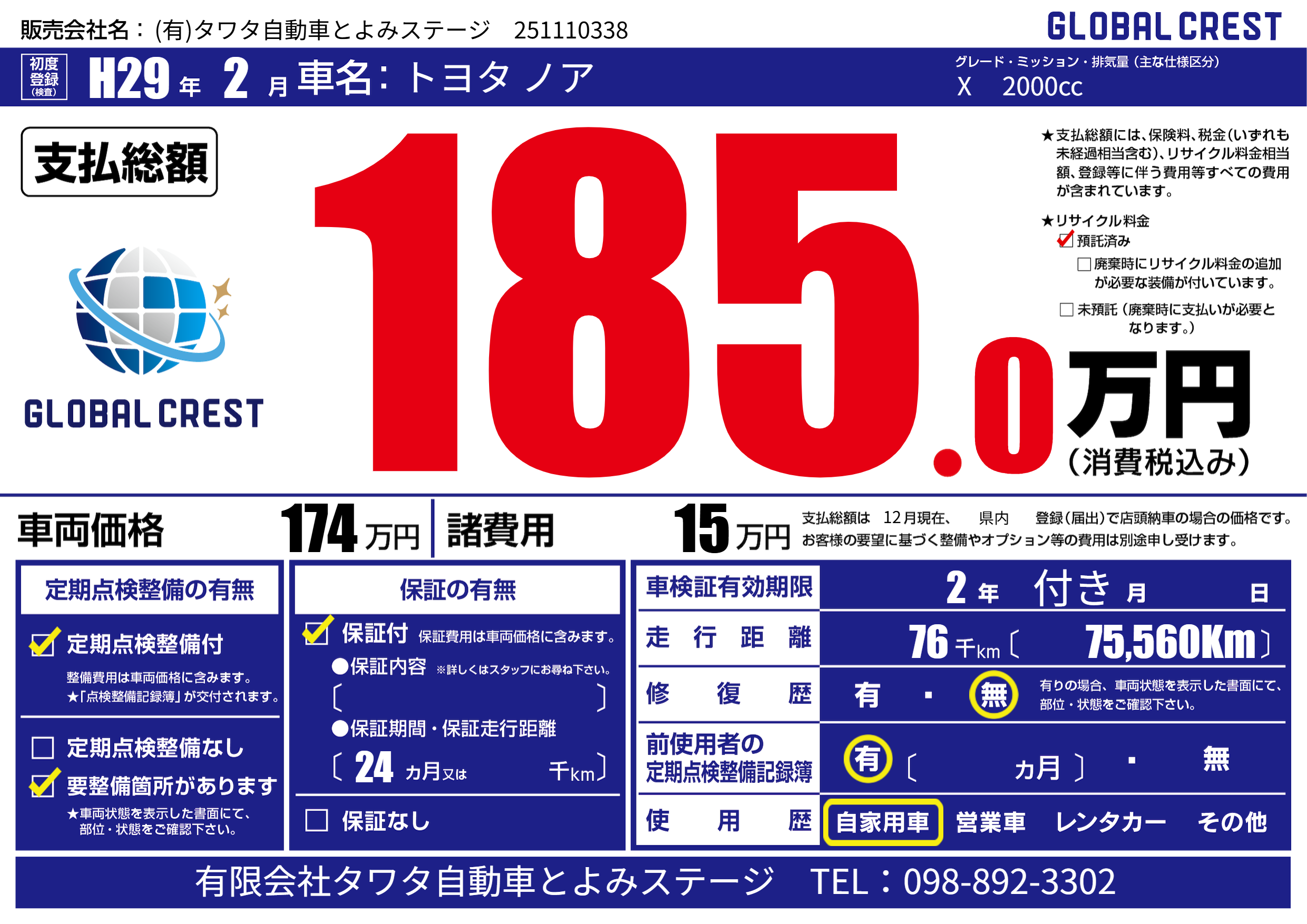 | 車名 | トヨタ ノア | グレード ミッション 排気量 |