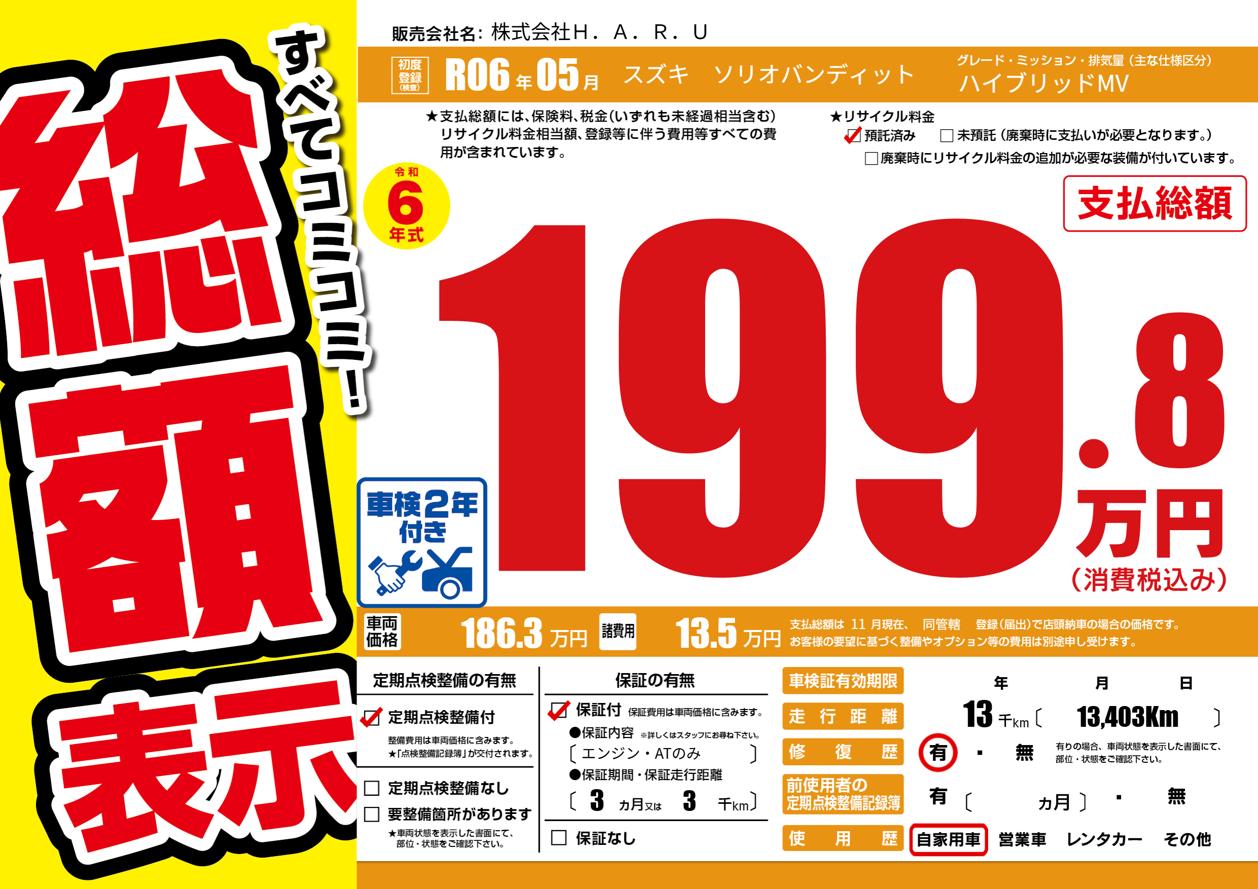 | 走行キロ | 1.3万km | 初年度登録 | R06年05月 |