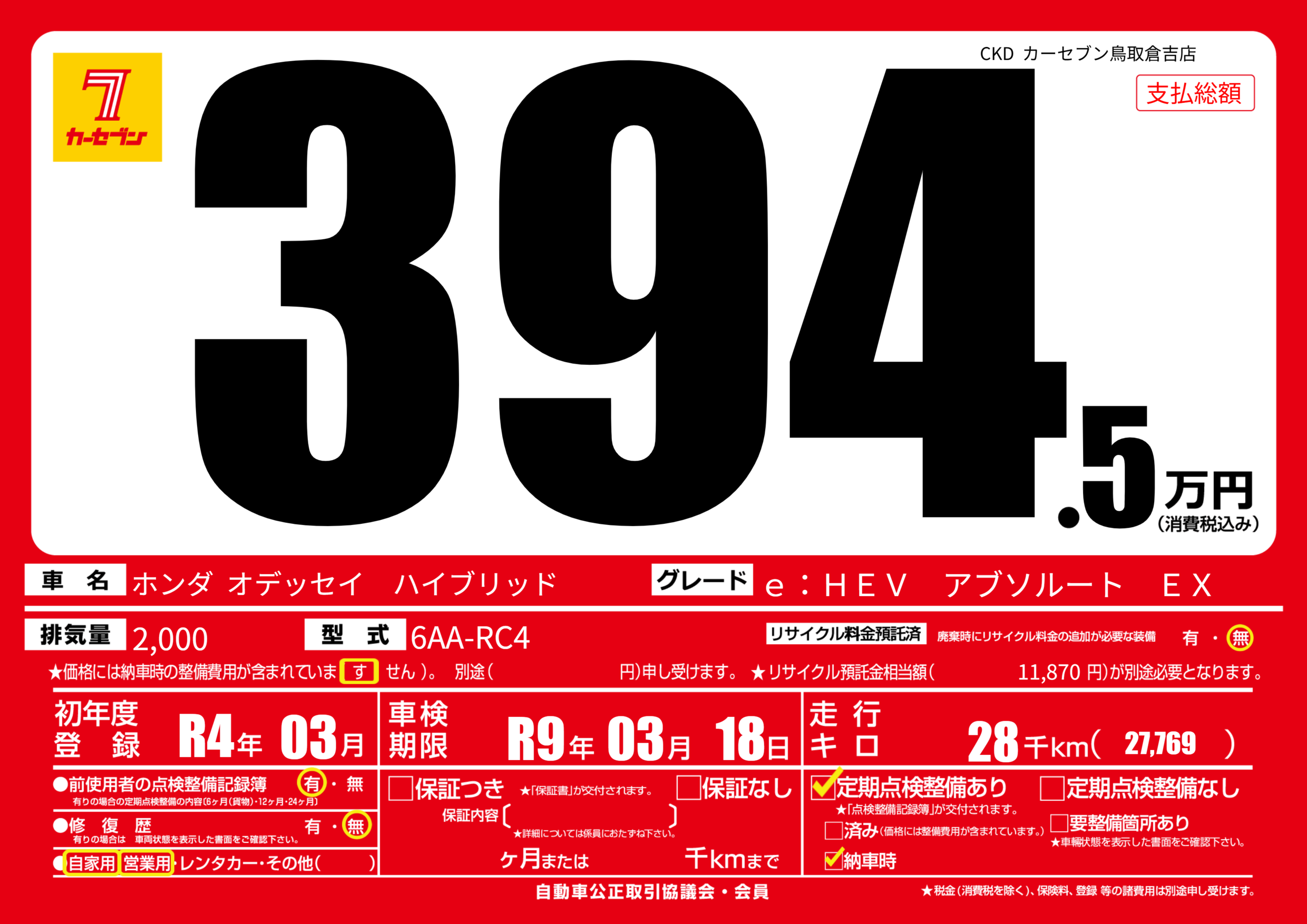 | 走行キロ | 2.8万km | 初年度登録 | R4年03月 |