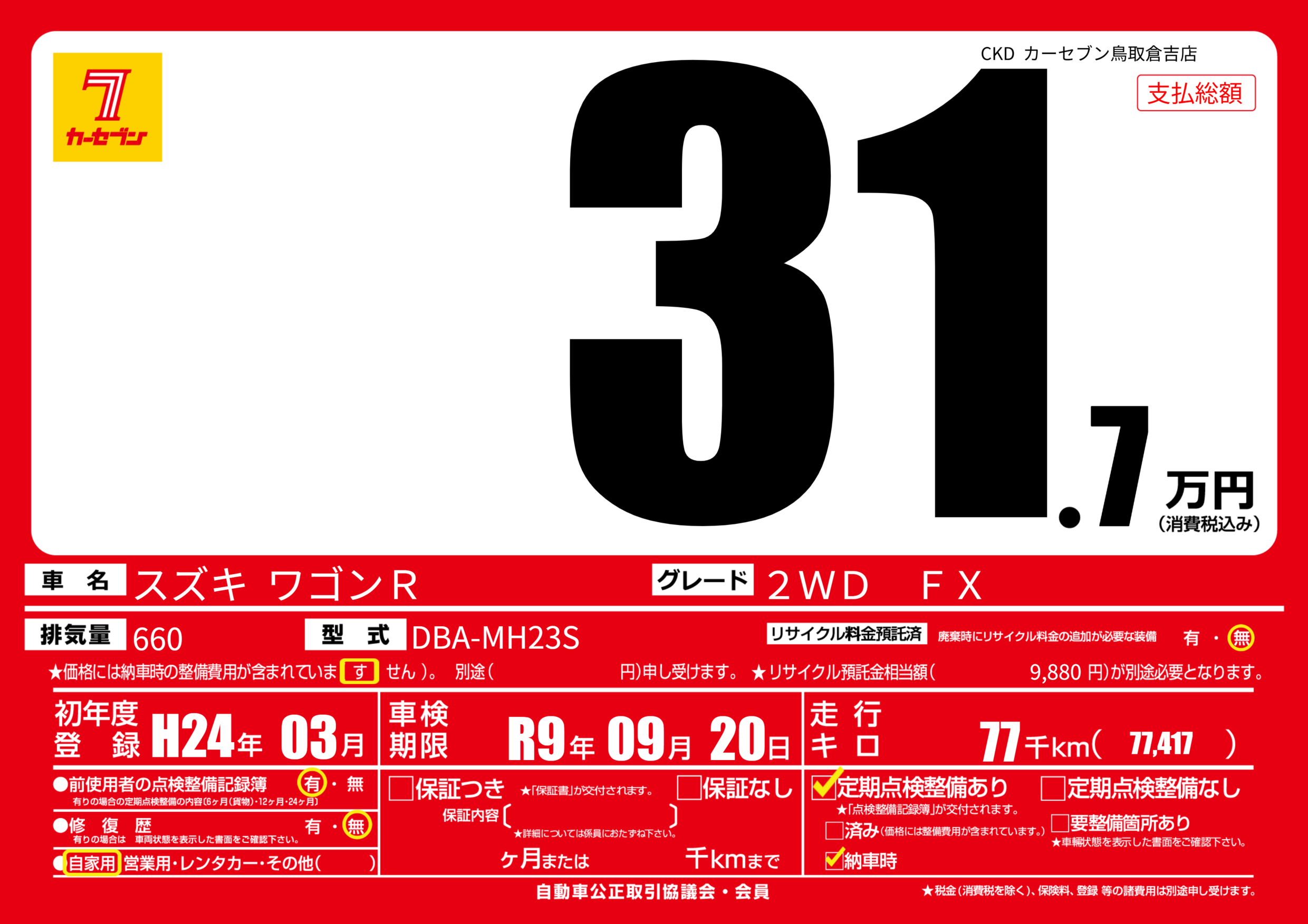 | 走行キロ | 7.7万km | 初年度登録 | H24年03月 |