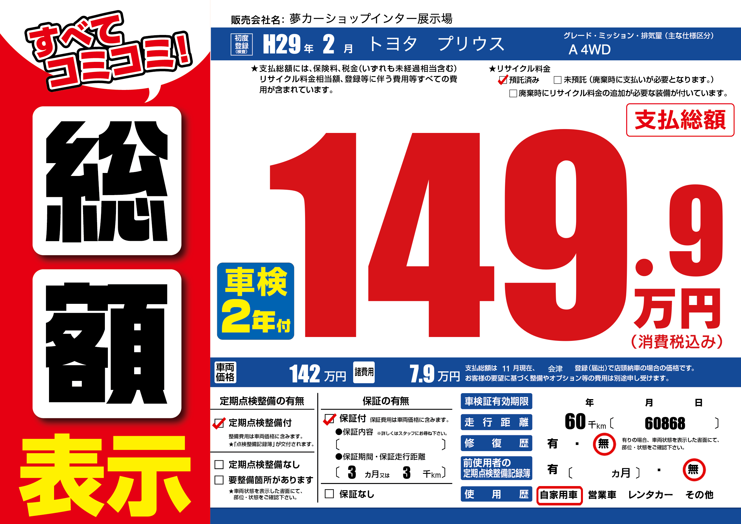 | 車名 | トヨタ プリウス | グレード ミッション 排気量 |