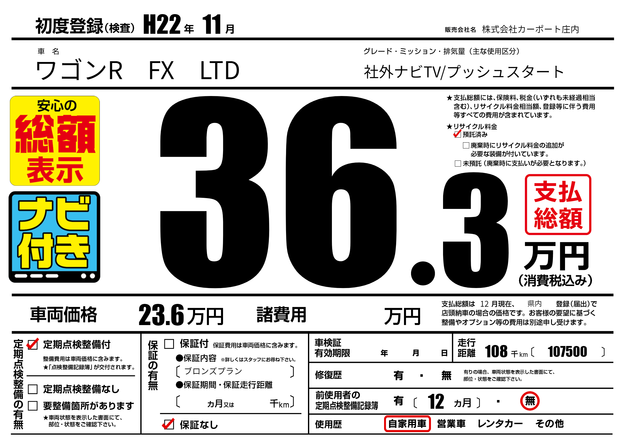 | 走行キロ | 10.8万km | 初年度登録 | H22年11月 |